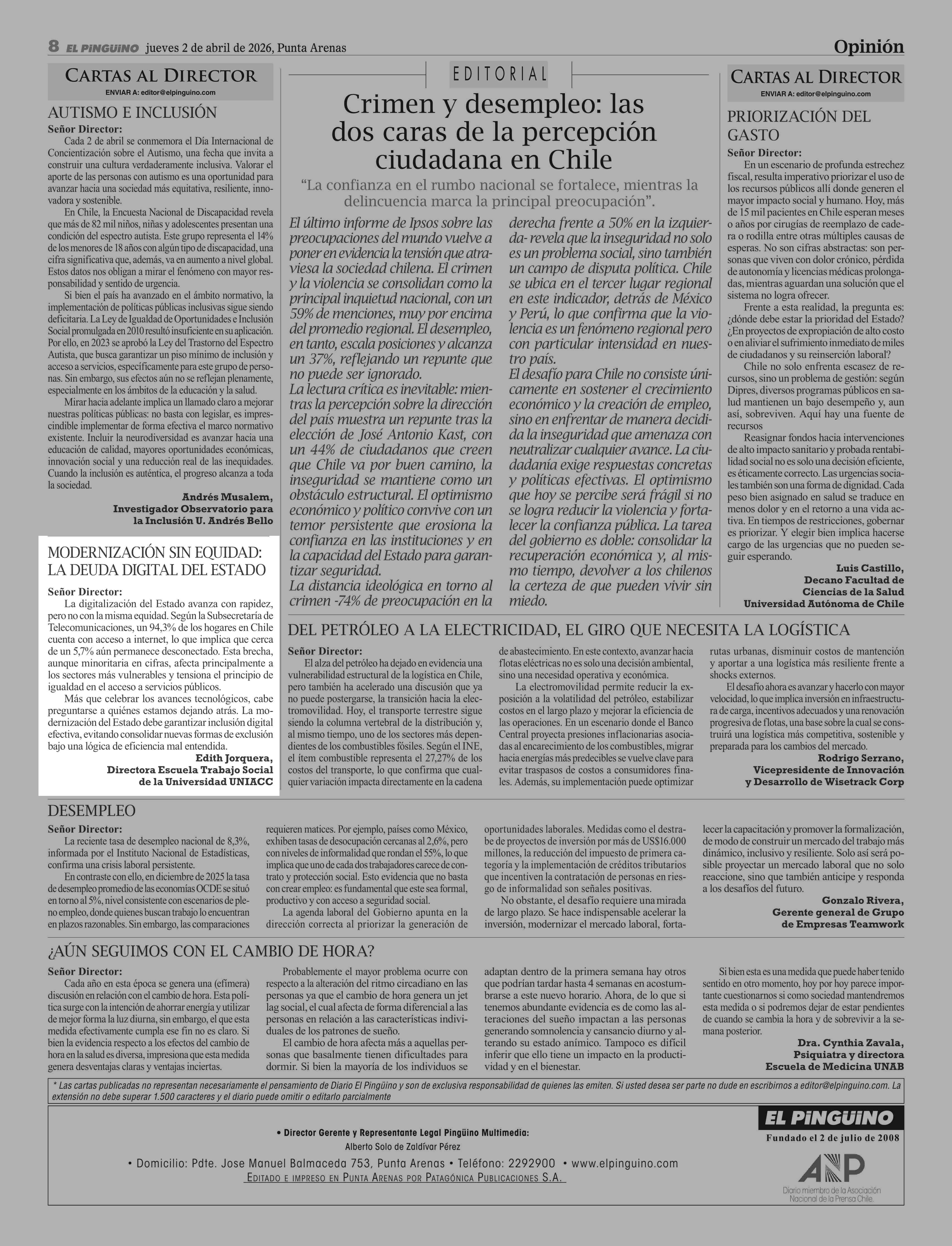 Cartas: Modernización sin equidad: la deuda digital del estado 02-04-2026 El Pingüino |