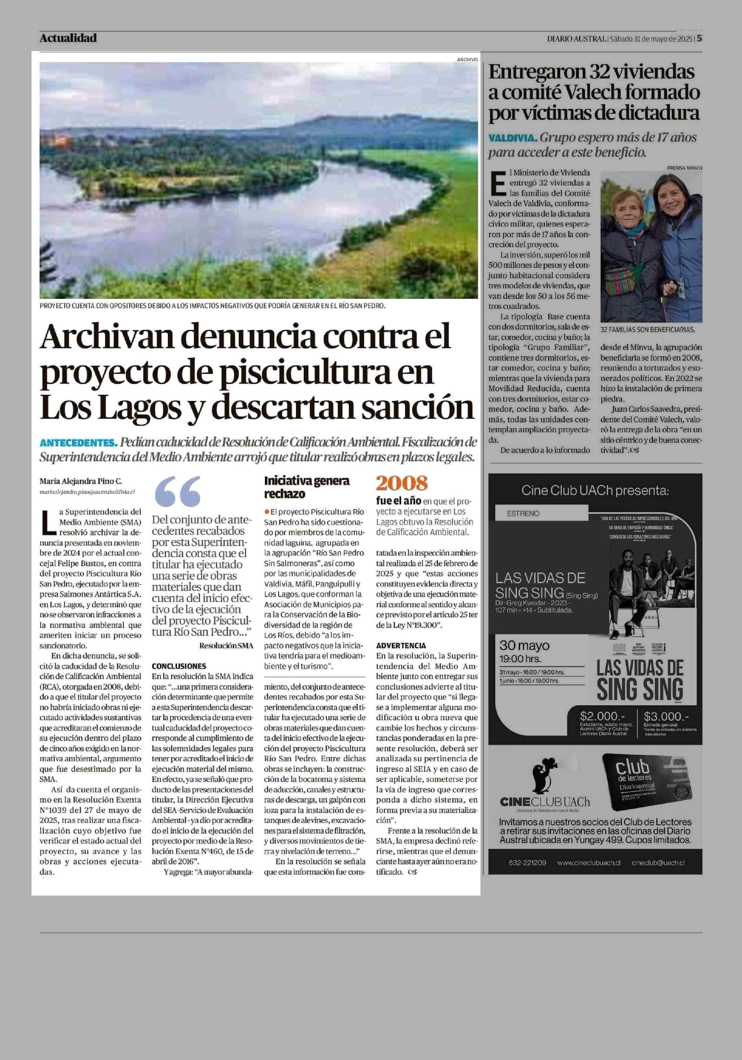 Archivan denuncia contra el proyecto de piscicultura en Los Lagos y descartan sanción 31-05-2025 Diario Austral Región de Los Ríos |