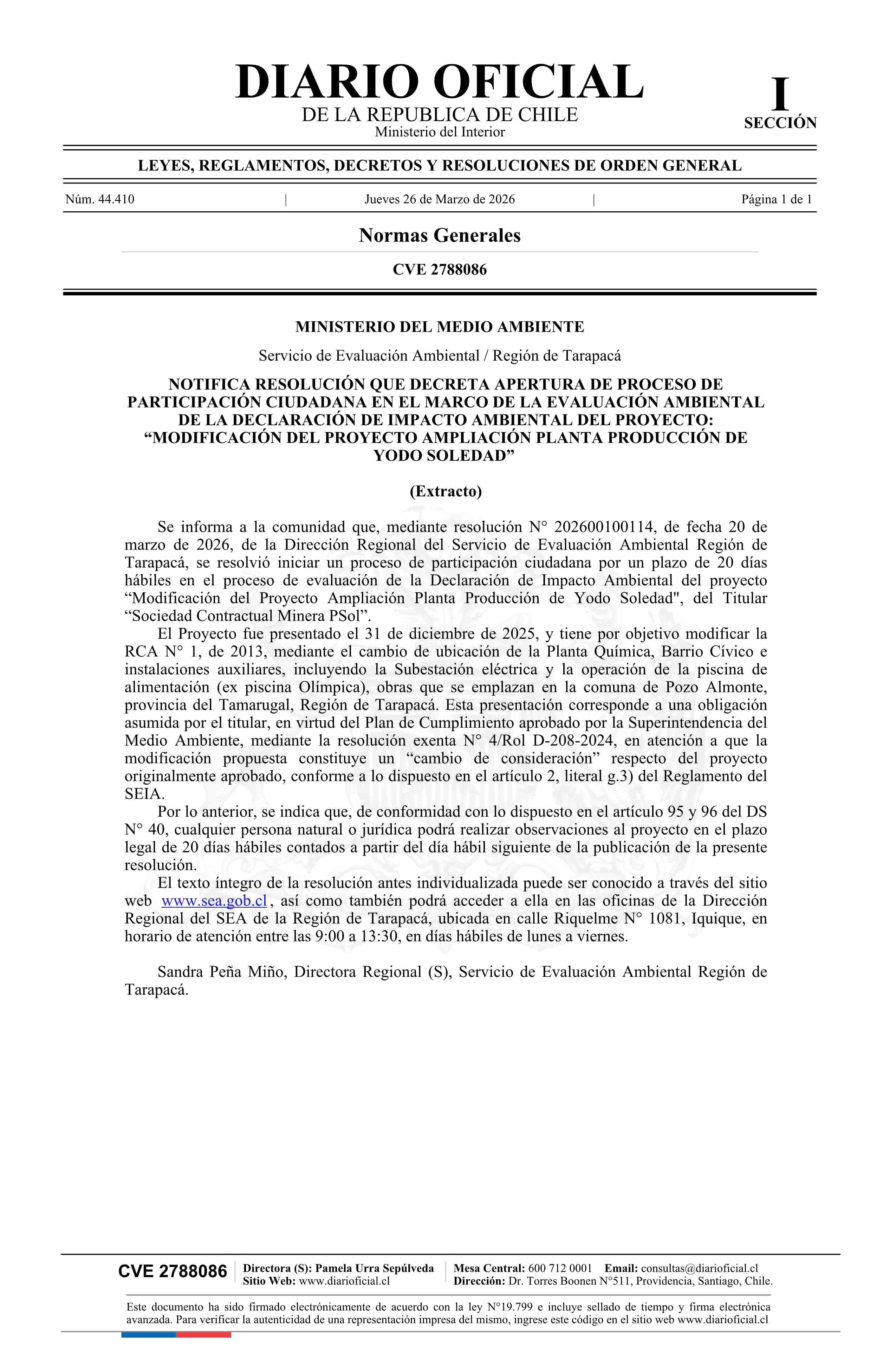 | Título: | Extracto de resolución exenta número 202600100114, de 2026.- Inicia proceso de participación ciudadana en el marco de la evaluación ambiental de la Declaración de Impacto Ambiental del proyecto Modificación del Proyecto Ampliación Planta Producción de Yodo Soledad |