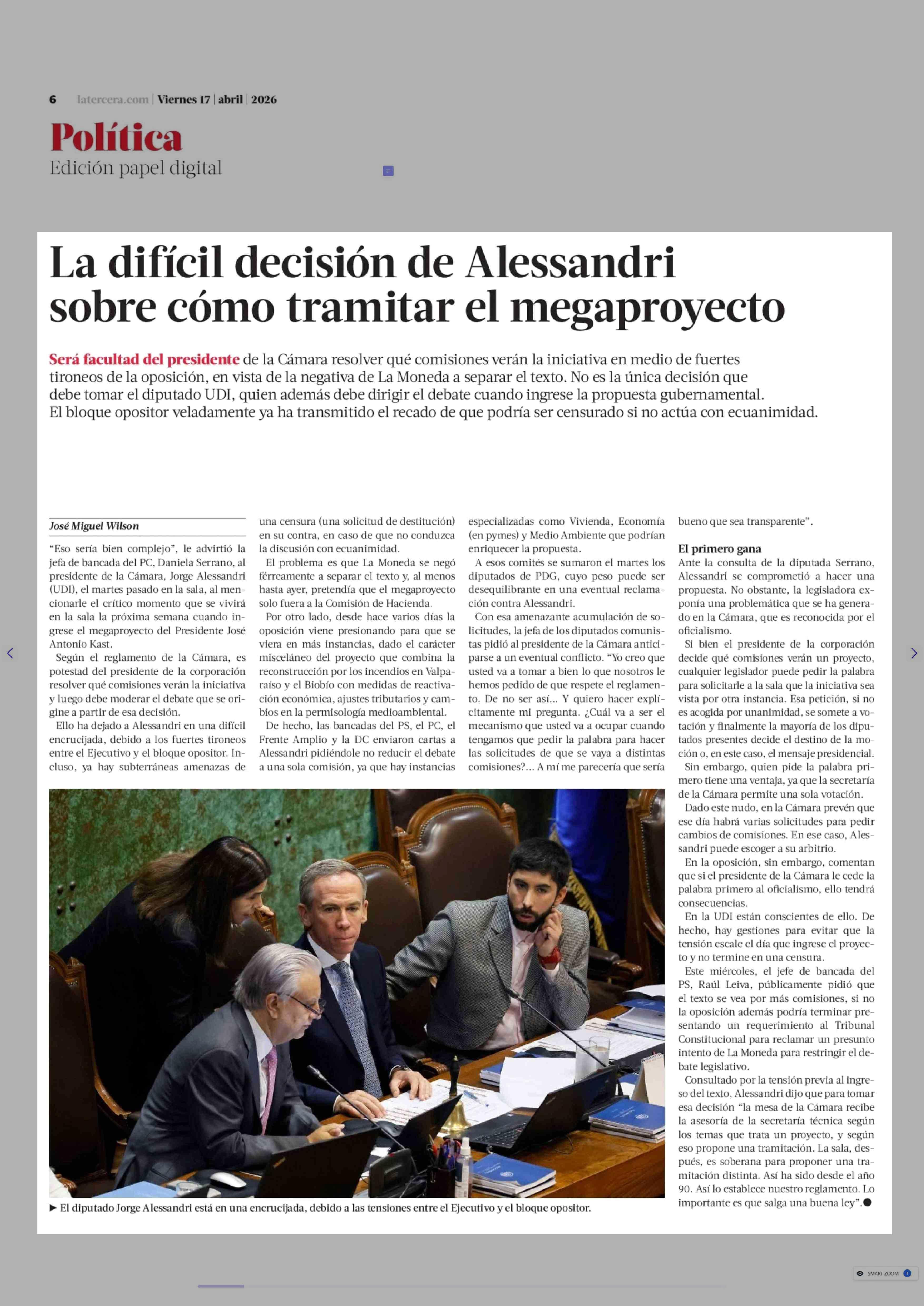 La difícil decisión de Alessandri sobre cómo tramitar el megaproyecto 17-04-2026 La Tercera |