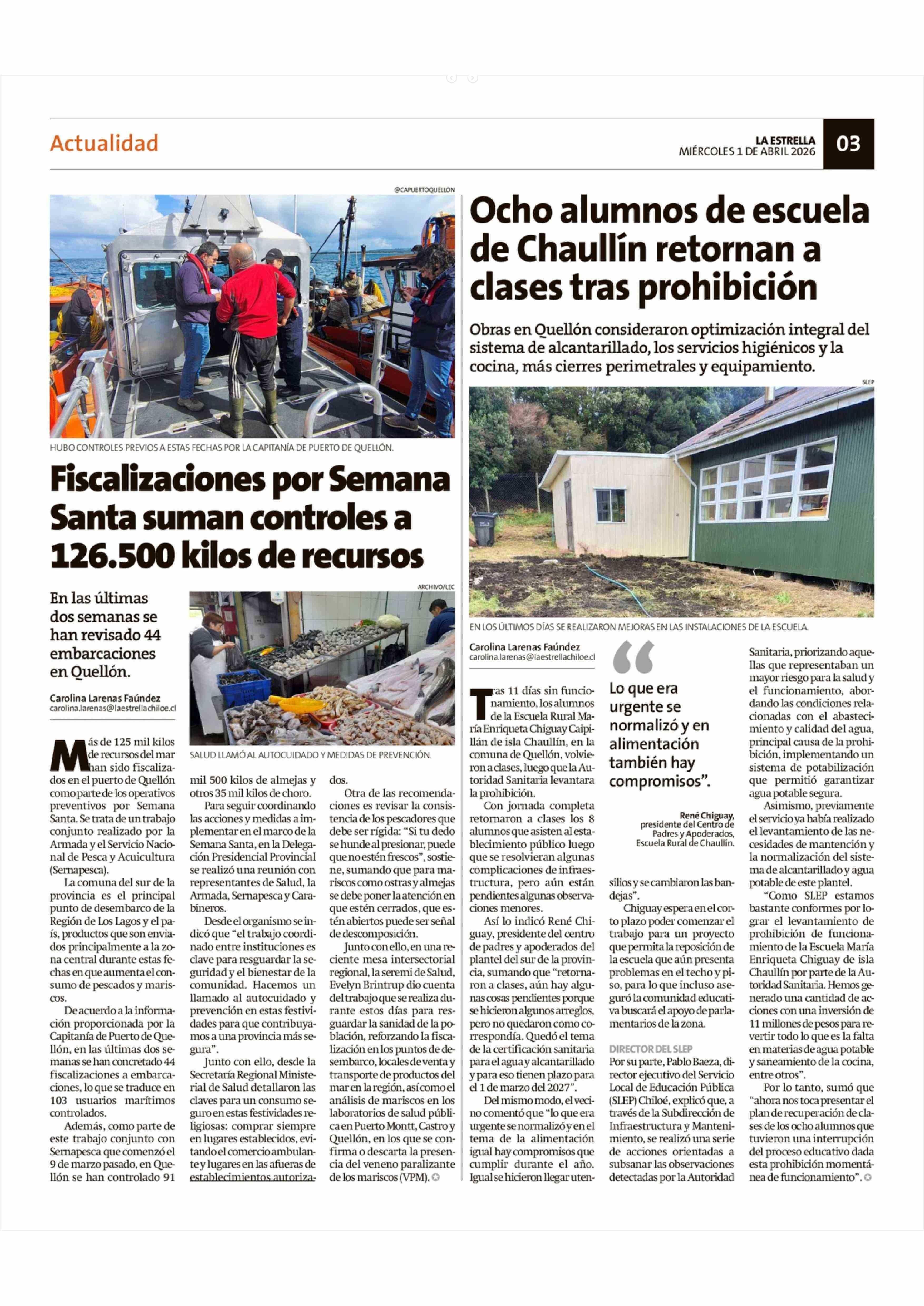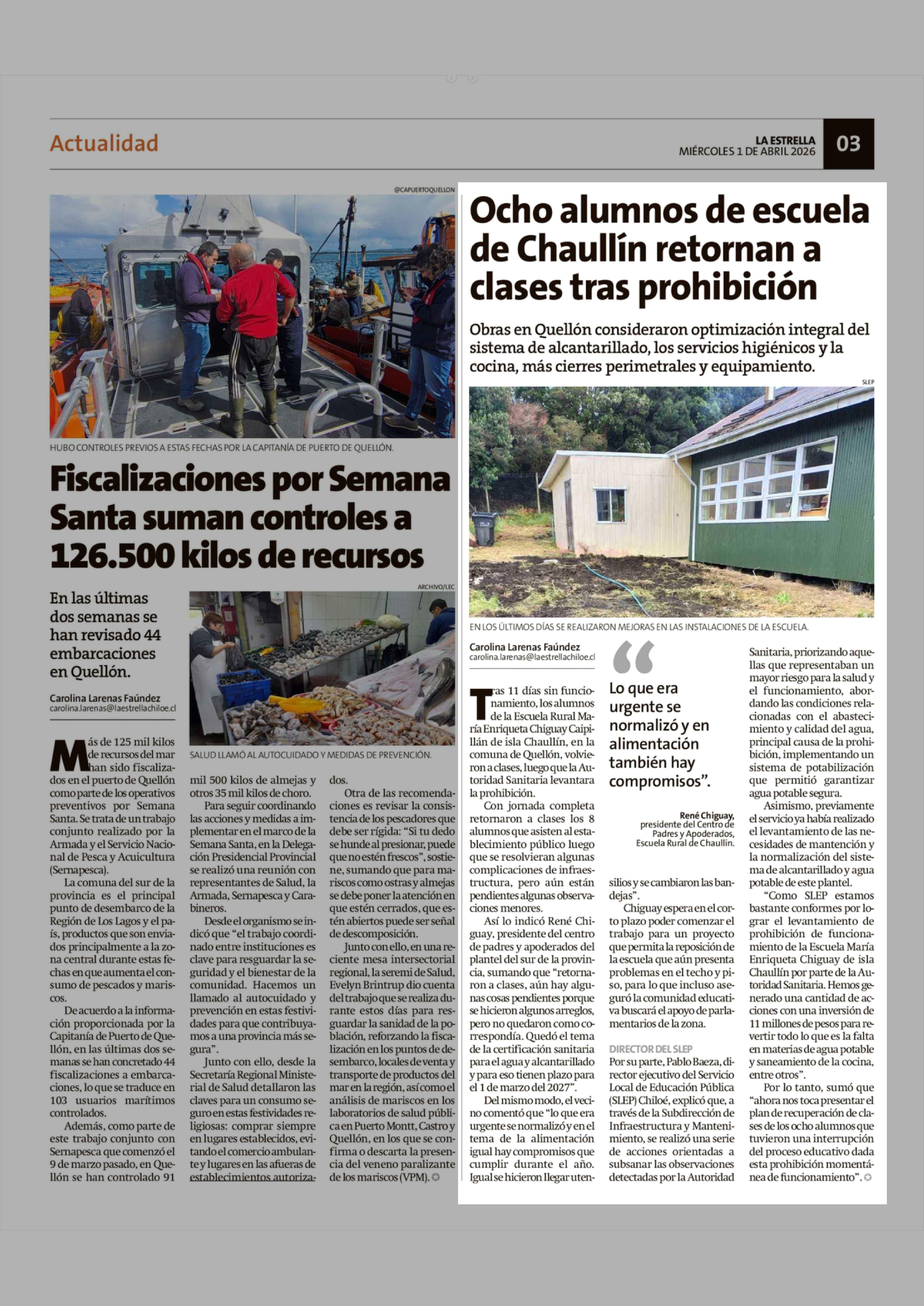 Ocho alumnos de escuela de Chaullín retornan a clases tras prohibición 01-04-2026 La Estrella de Chiloé |