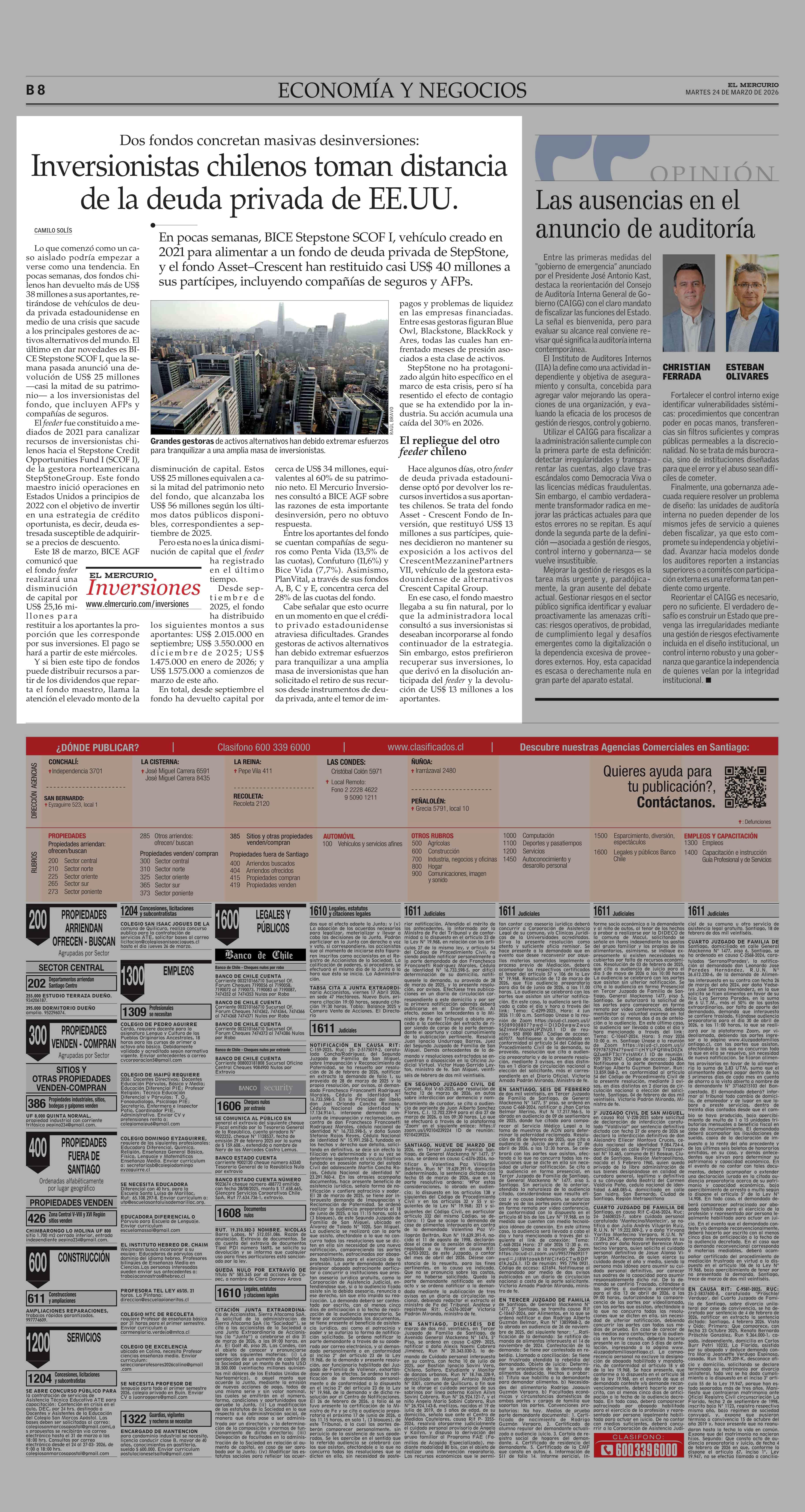 Inversionistas chilenos toman distancia de la deuda privada de EE.UU. 24-03-2026 El Mercurio |