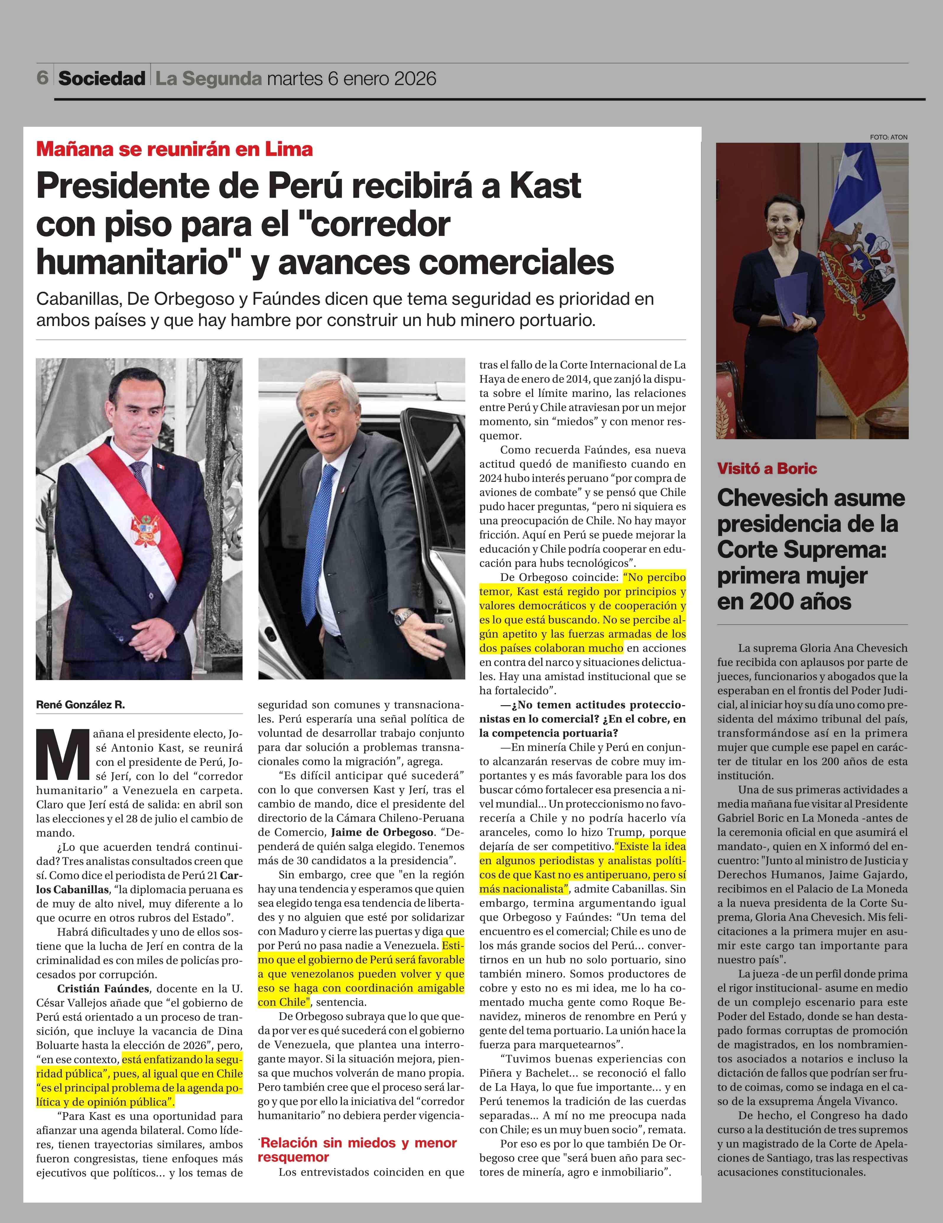 Presidente de Perú recibirá a Kast con piso para el "corredor humanitario" y avances comerciales 06-01-2026 La Segunda |