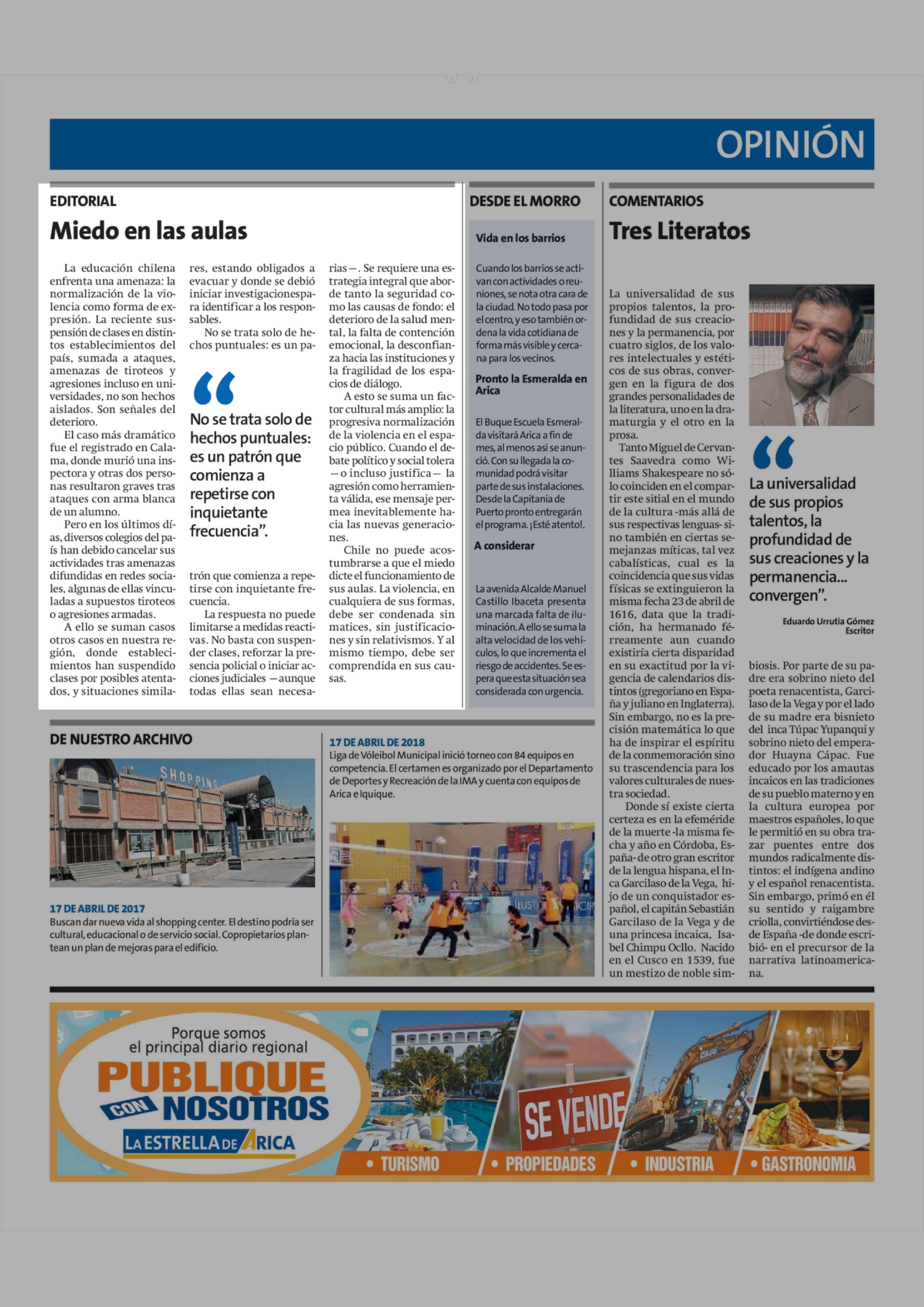 Editorial: Miedo en las aulas 17-04-2026 La Estrella de Arica |