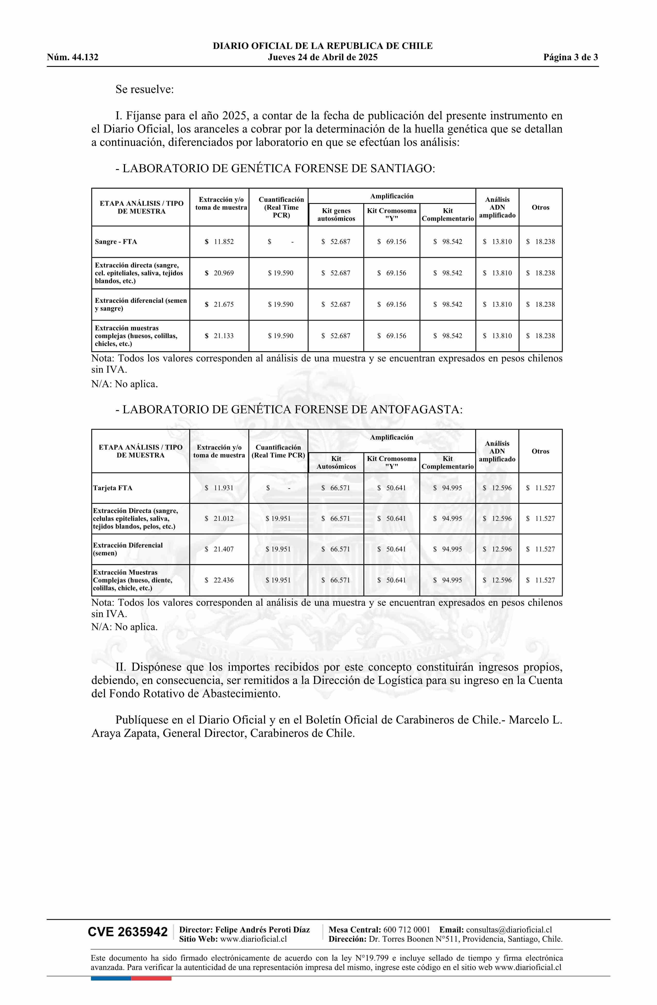 | Título: | Resolución exenta número 252, de 2025.- Determinación de la huella genética y/o análisis comparativo de ADN: Fija aranceles a cobrar durante el año 2025 |