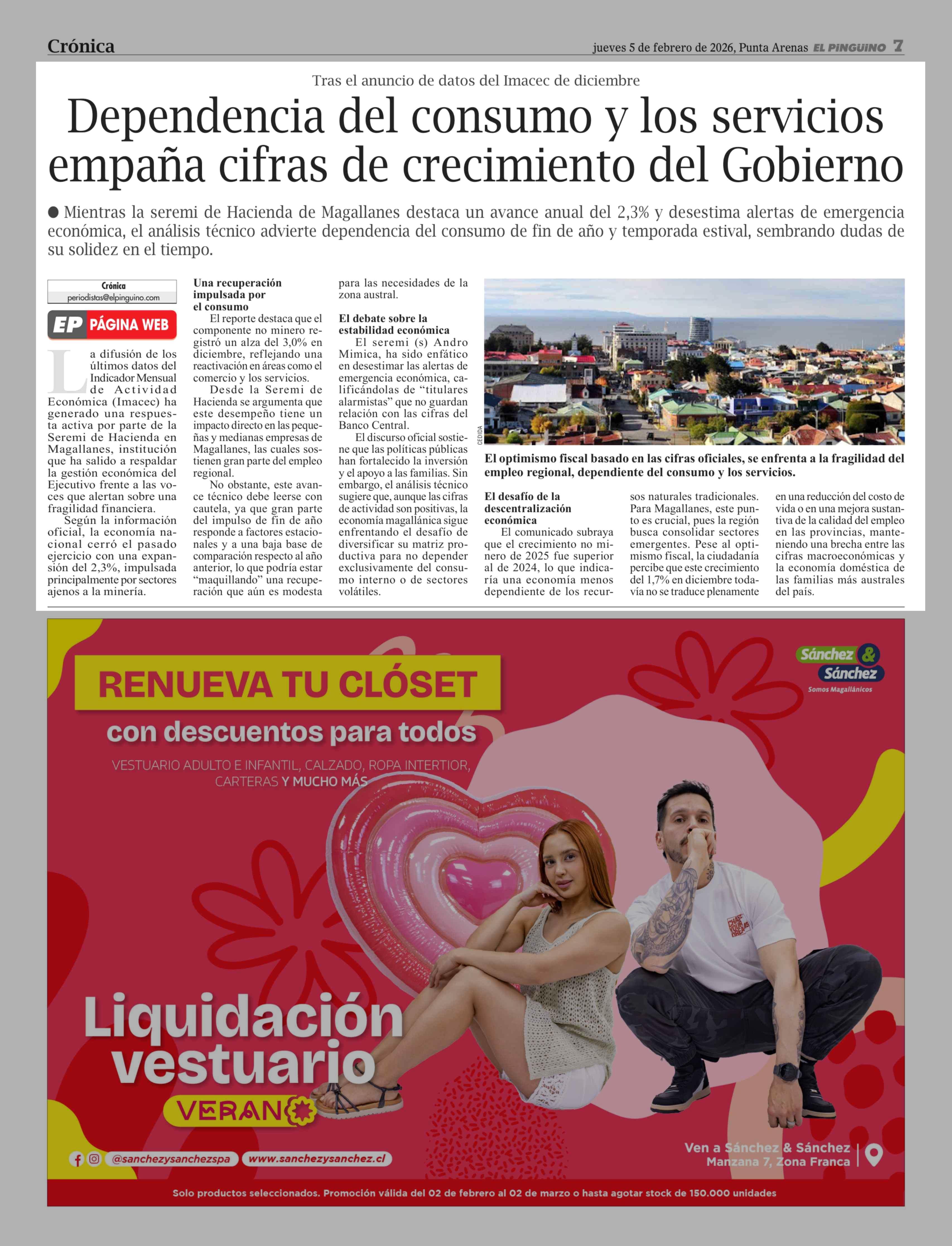 Dependencia del consumo y los servicios empaña cifras de crecimiento del Gobierno 05-02-2026 El Pingüino |