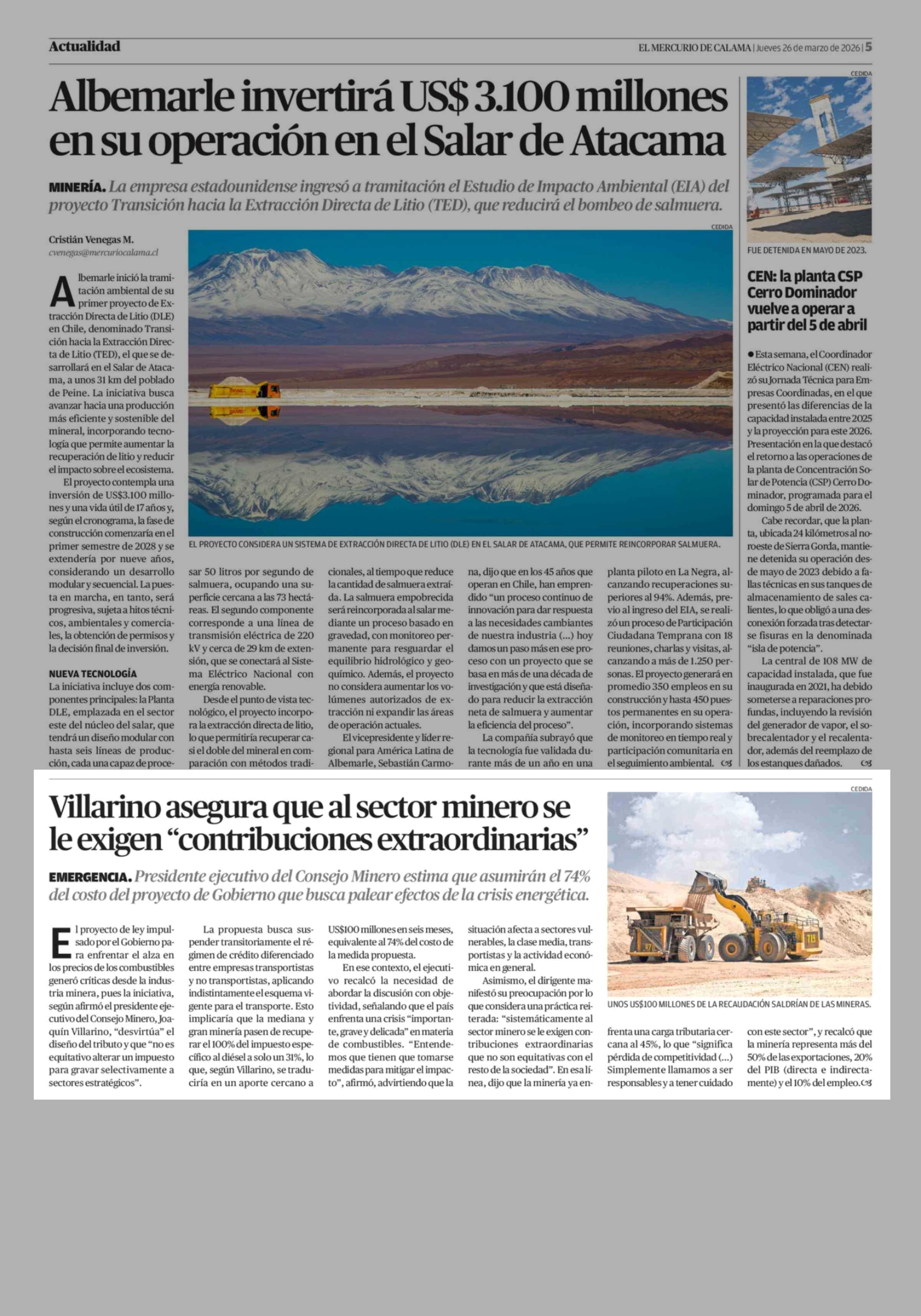 Villarino asegura que al sector minero se le exigen "contribuciones extraordinarias" 26-03-2026 El Mercurio de Calama |