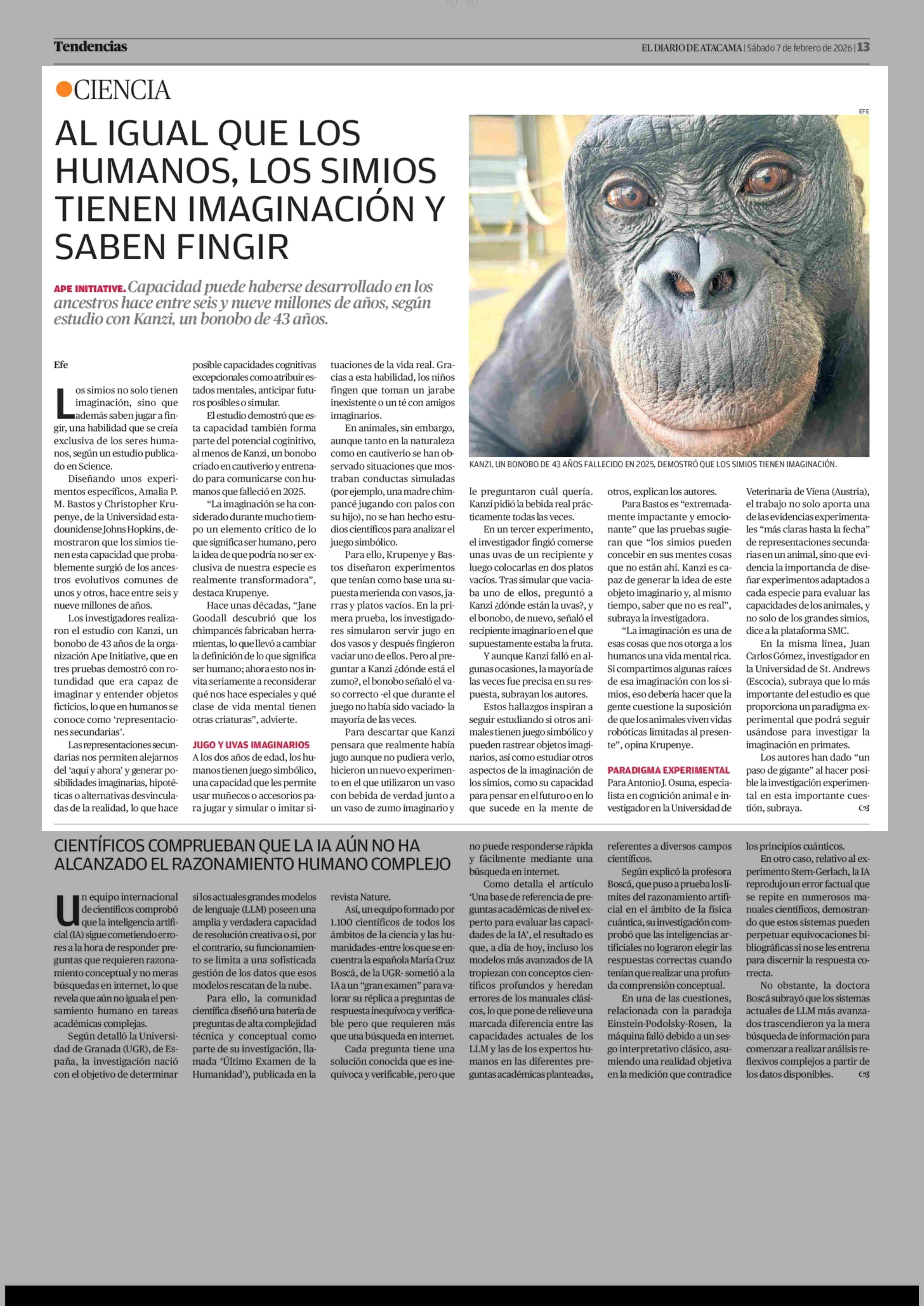 Título: AL IGUAL QUE LOS HUMANOS, LOS SIMIOS TIENEN IMAGINACIÓN Y SABEN FINGIR