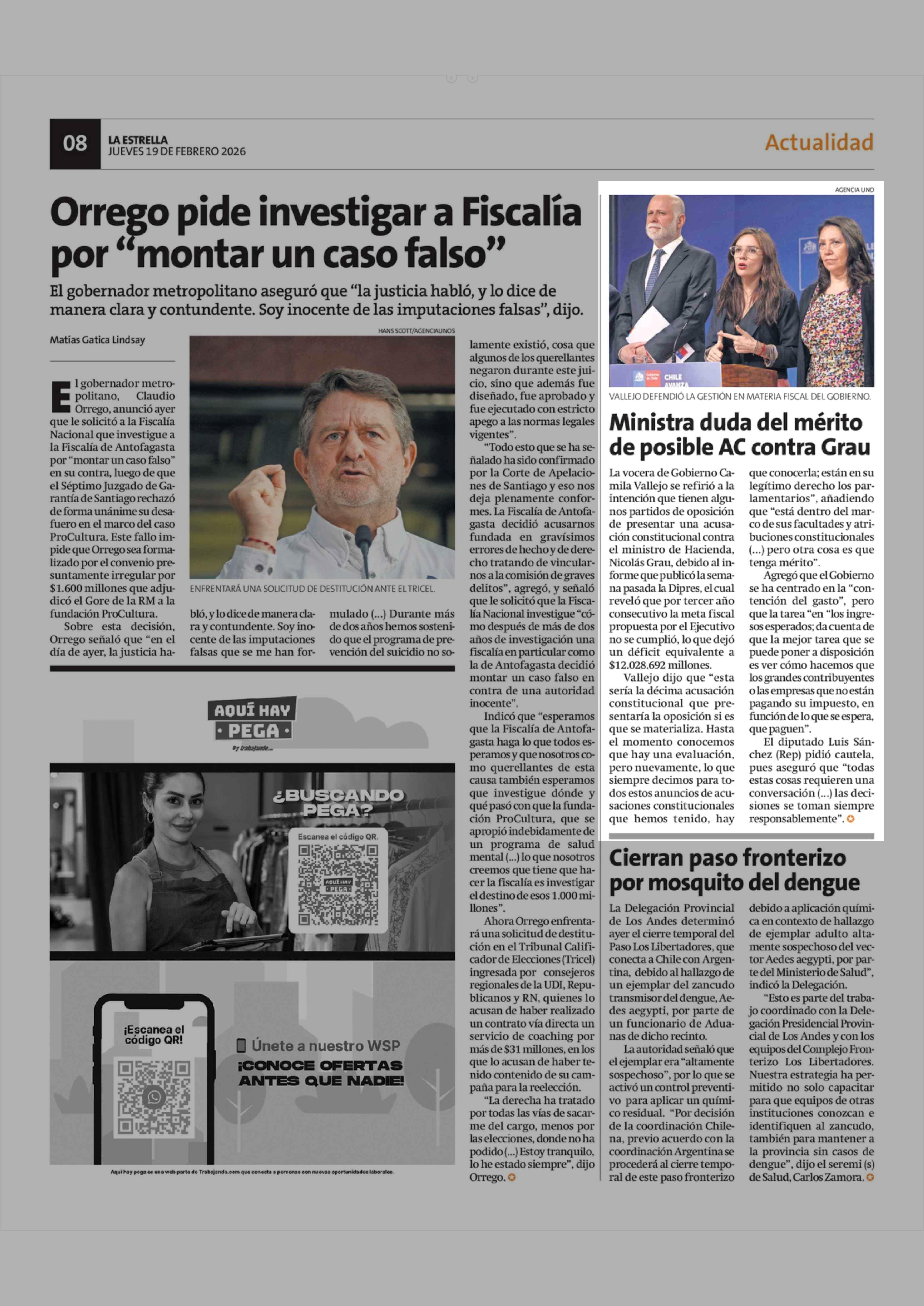 Ministra duda del mérito de posible AC contra Grau 19-02-2026 La Estrella de Concepción |