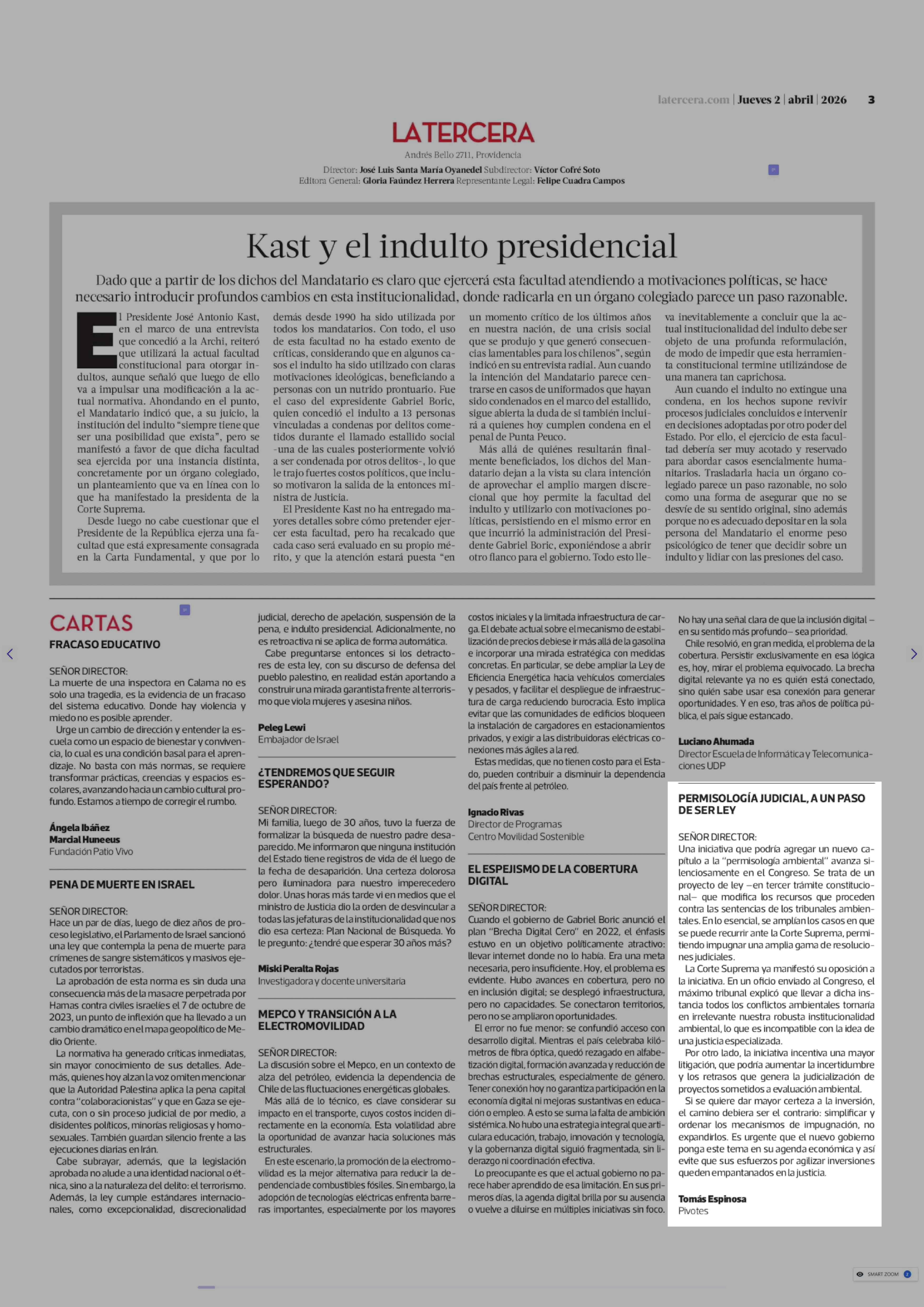 Cartas: PERMISOLOGÍA JUDICIAL, A UN PASO DE SER LEY 02-04-2026 La Tercera |