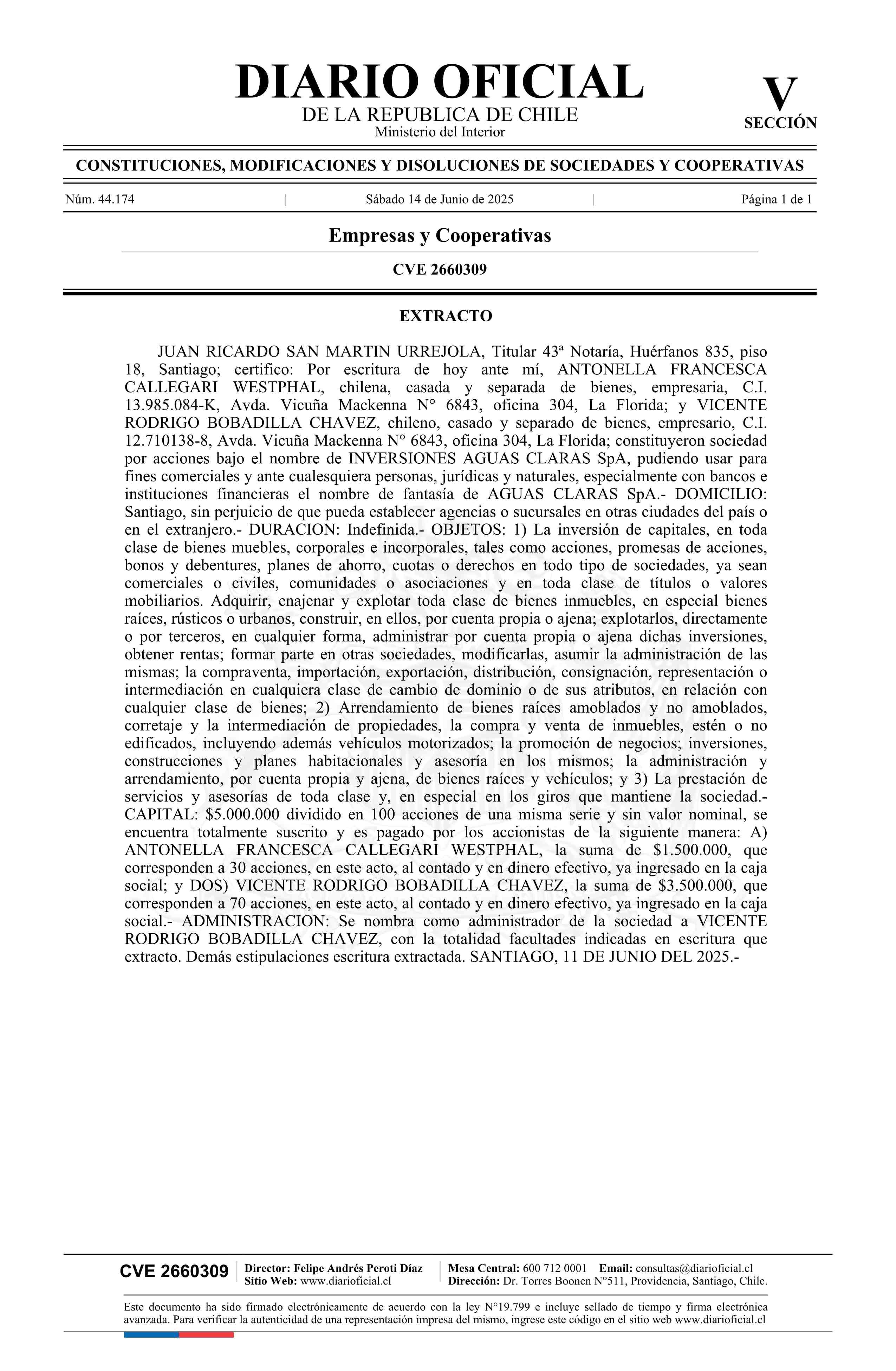 INVERSIONES AGUAS CLARAS SpA 14-06-2025 Diario Oficial Edición Electrónica |