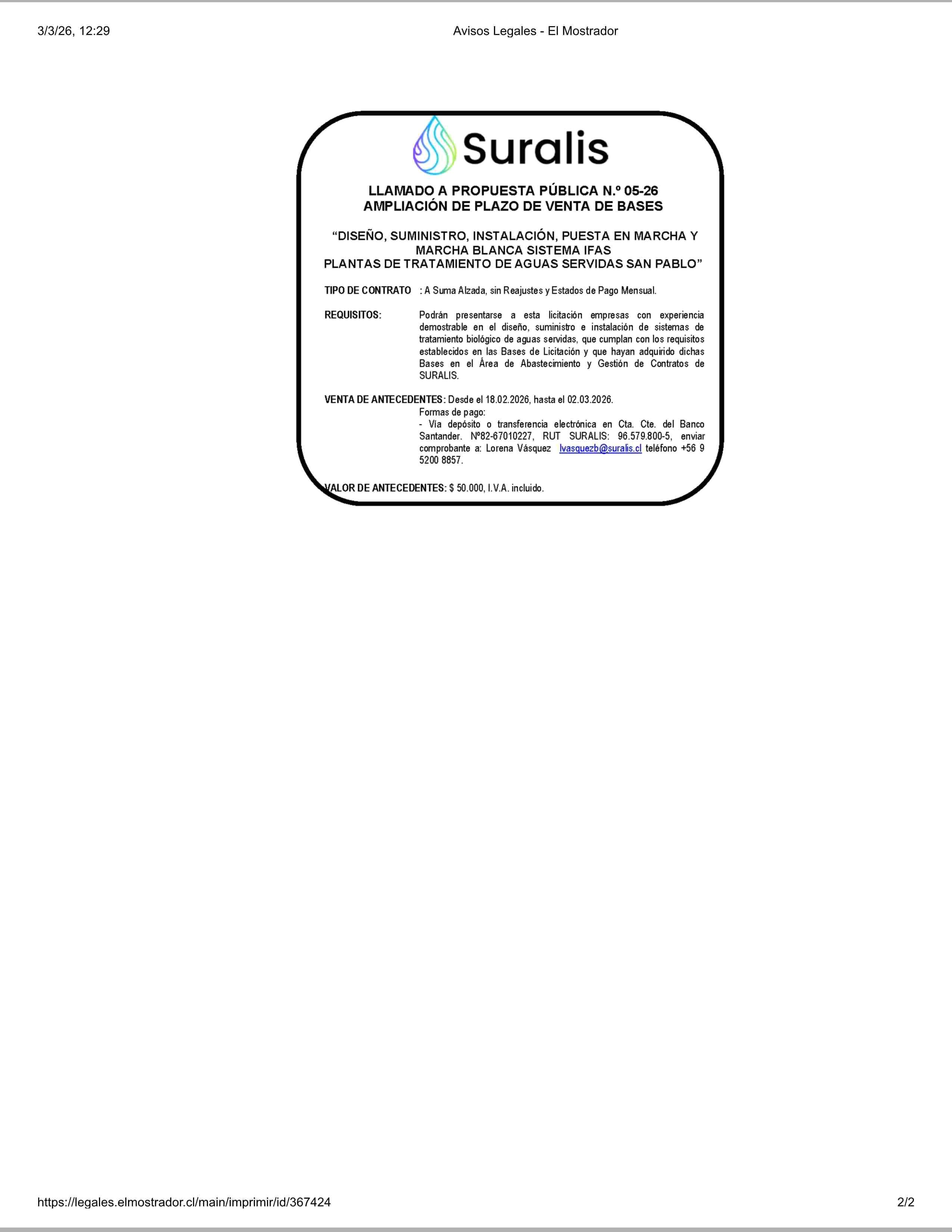 | Título: | AVISO LICITACIONES: SURALIS LICITACIÓN PÚBLICA N.* 05-26 AMPLIACIÓN DE PLAZO DE VENTA DE BASES “DISEÑO, SUMINISTRO, INSTALACIÓN, PUESTA EN MARCHA Y MARCHA BLANCA SISTEMA IFAS PLANTAS DE TRATAMIENTO DE AGUAS SERVIDAS SAN PABLO” |