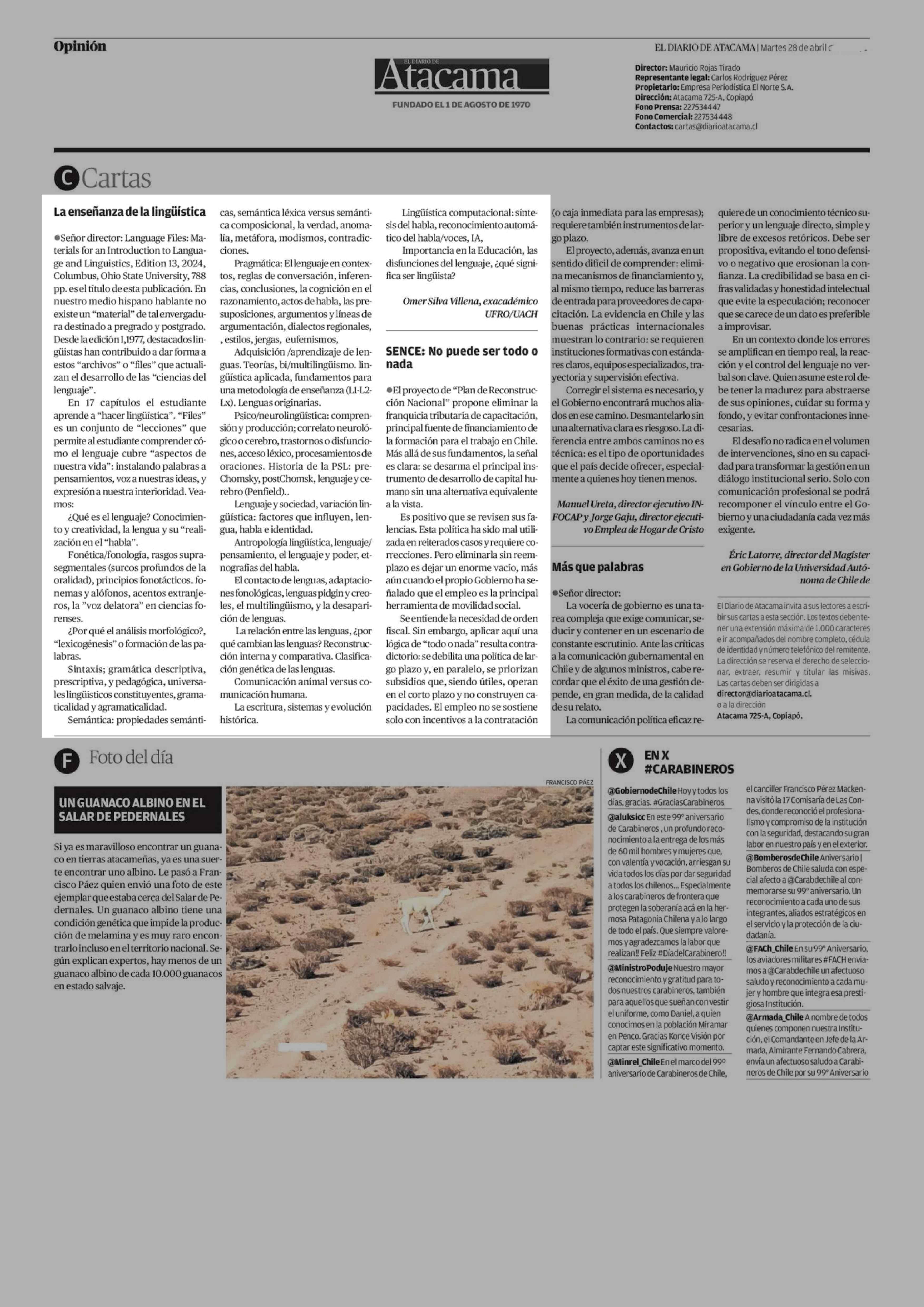 Cartas: La enseñanza de la lingüística 28-04-2026 El Diario de Atacama |