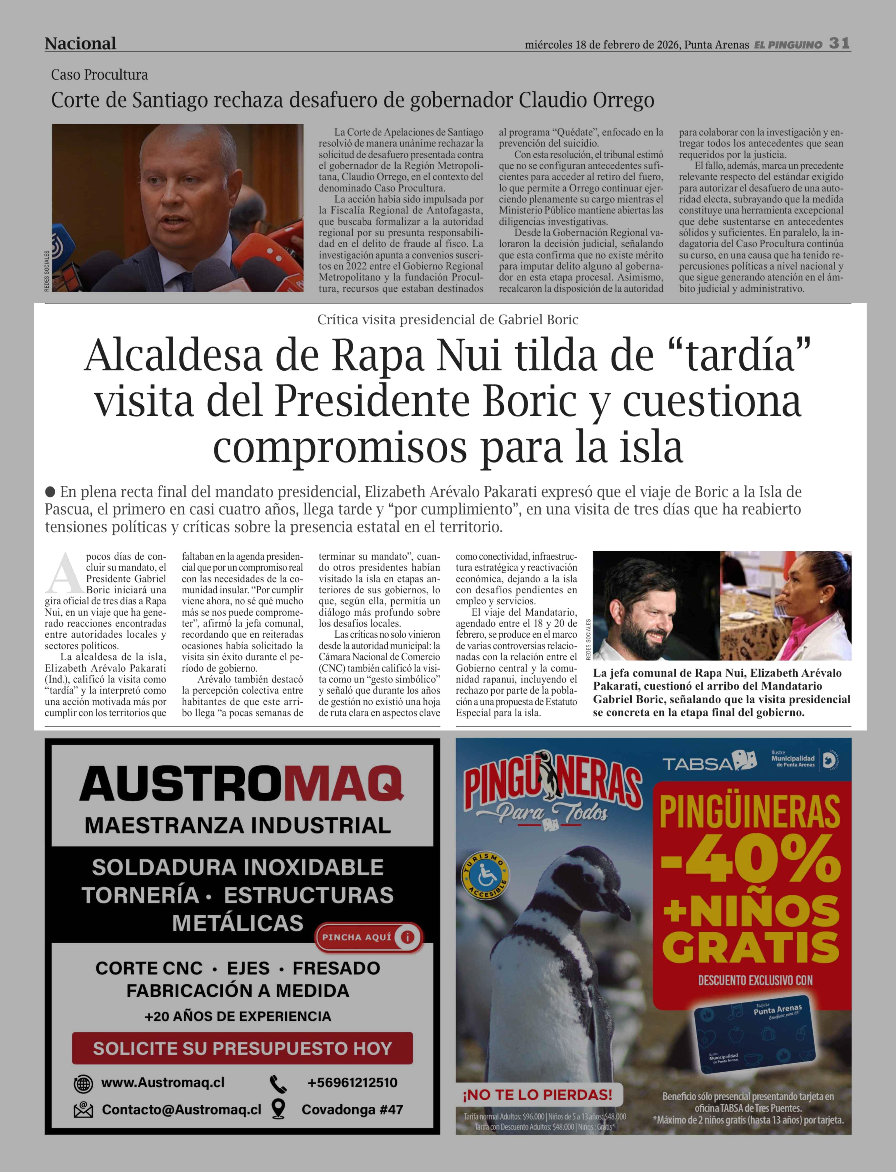 Alcaldesa de Rapa Nui tilda de "tardía" visita del Presidente Boric y cuestiona compromisos para la isla 18-02-2026 El Pingüino |