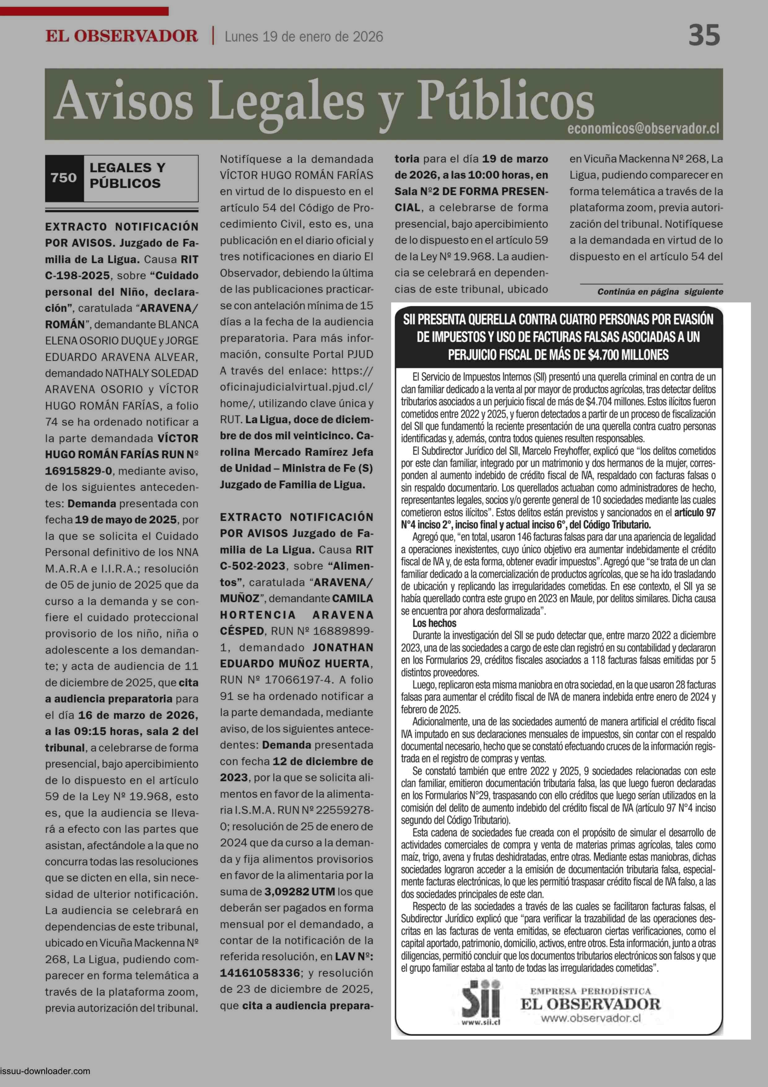 EXTRACTOS: SIl PRESENTA QUERELLA CONTRA CUATRO PERSONAS POR EVASIÓN DE IMPUESTOS Y USO DE FACTURAS FALSAS ASOCIADAS A UN PERJUICIO FISCAL DE MÁS DE $4.700 MILLONES 19-01-2026 El Observador Vespertino |