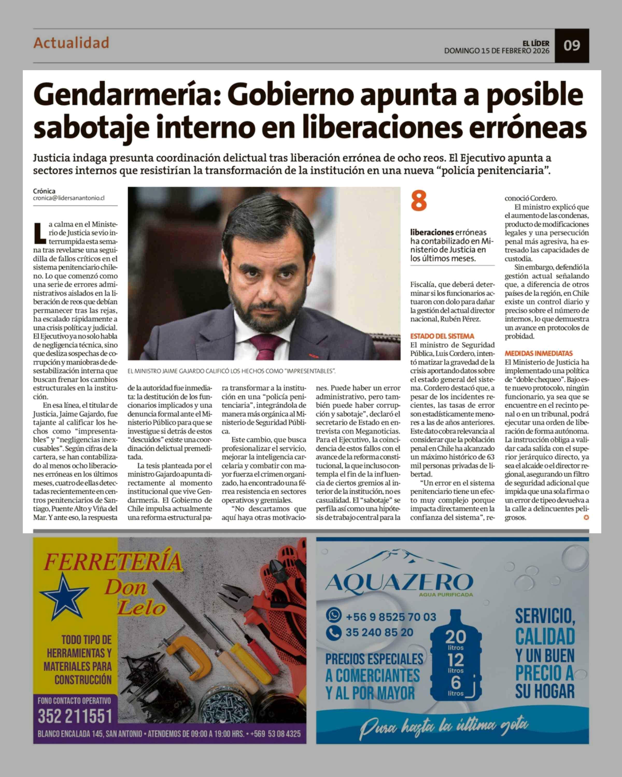 Gendarmería: Gobierno apunta a posible sabotaje interno en liberaciones erróneas 15-02-2026 El Líder |