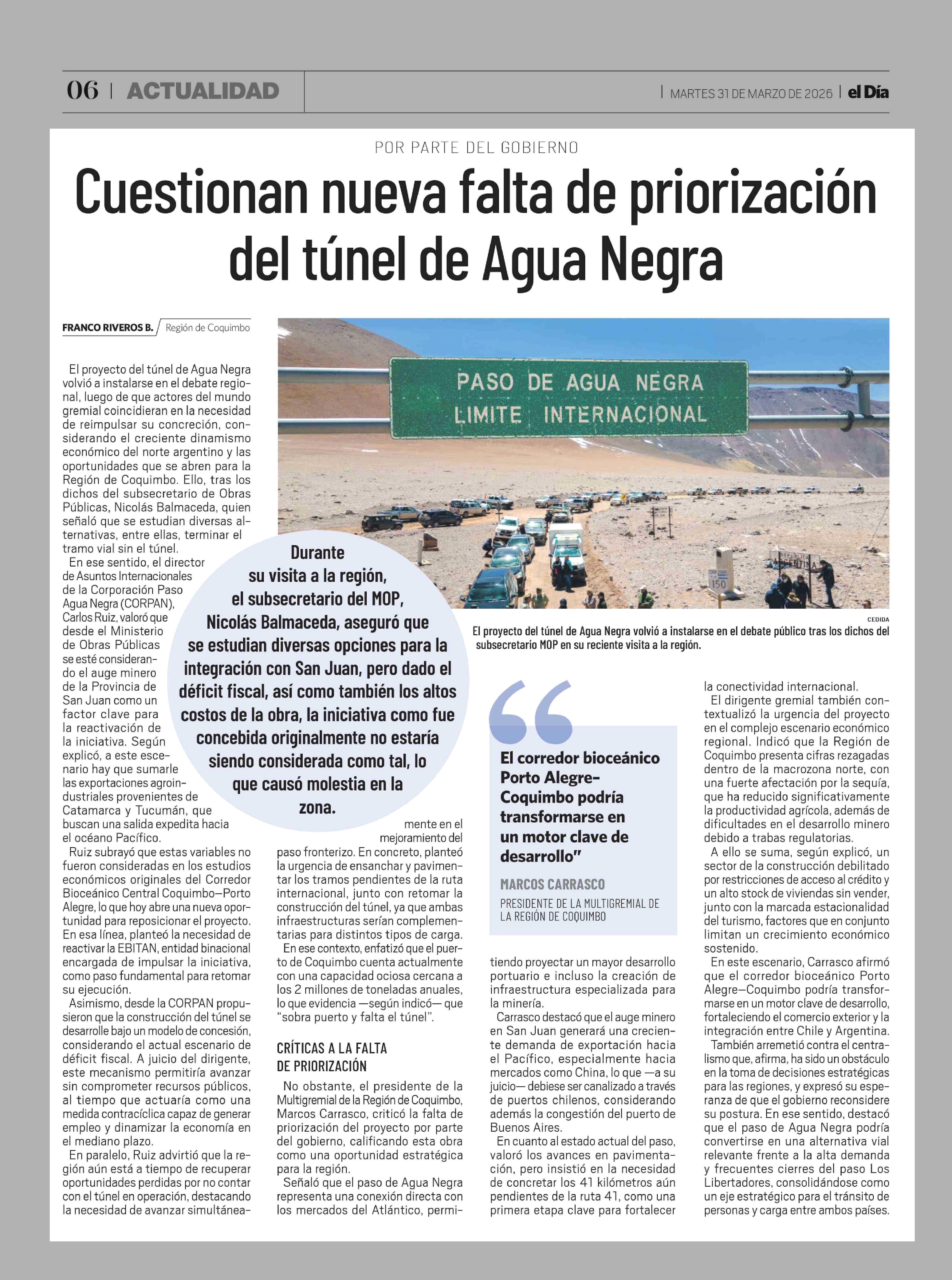 Cuestionan nueva falta de priorización del túnel de Agua Negra 31-03-2026 El Día |
