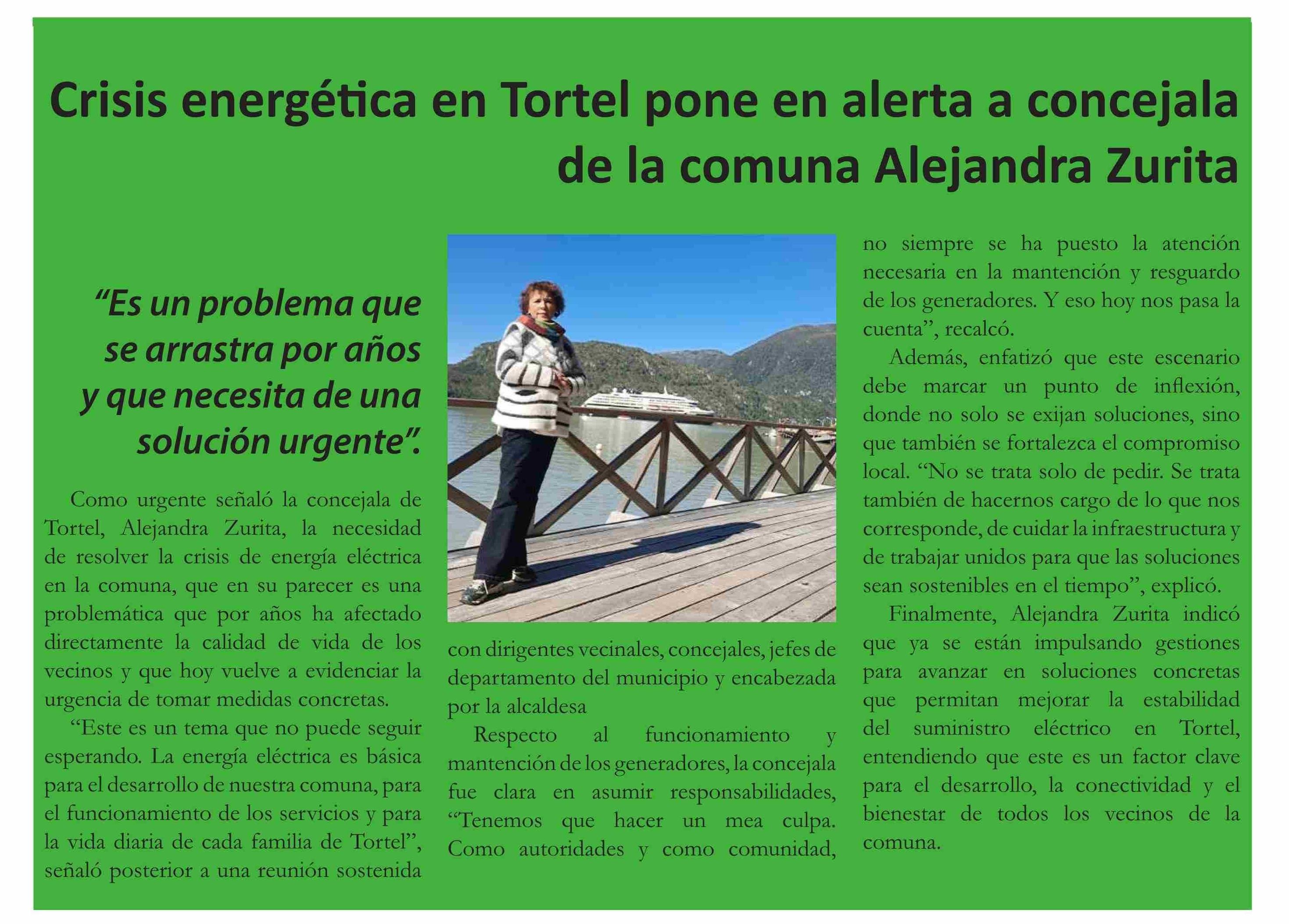 | Título: | Crisis energética en Tortel pone en alerta a concejala de la comuna Alejandra Zurita |