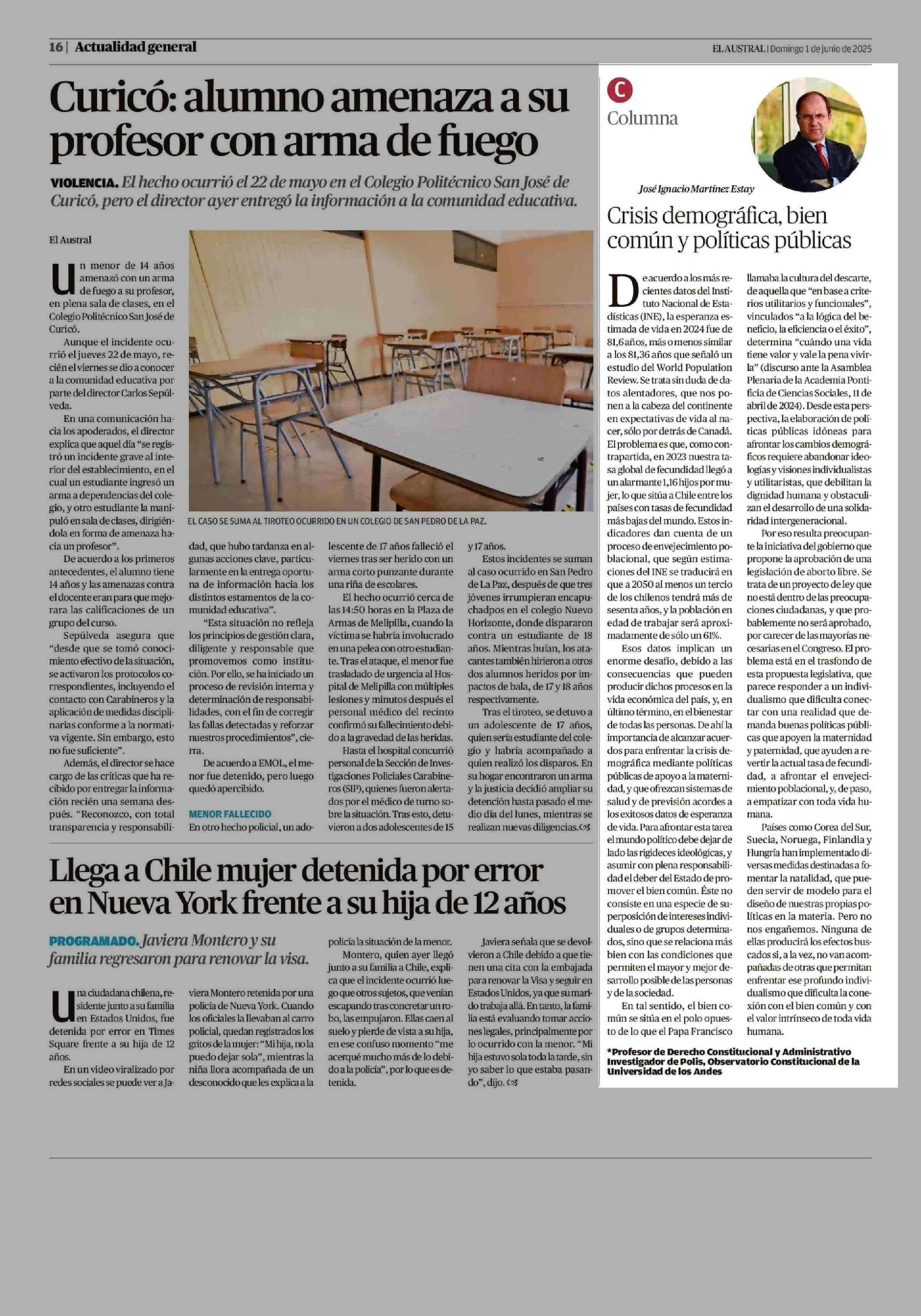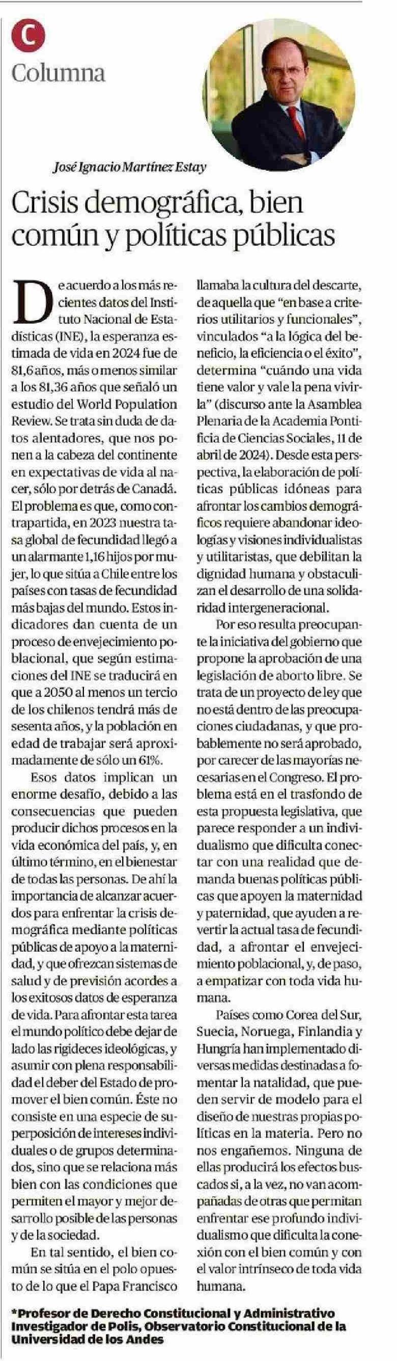 COLUMNAS DE OPINIÓN: Crisis demográfica, bien común y políticas públicas 01-06-2025 El Austral de la Araucanía |