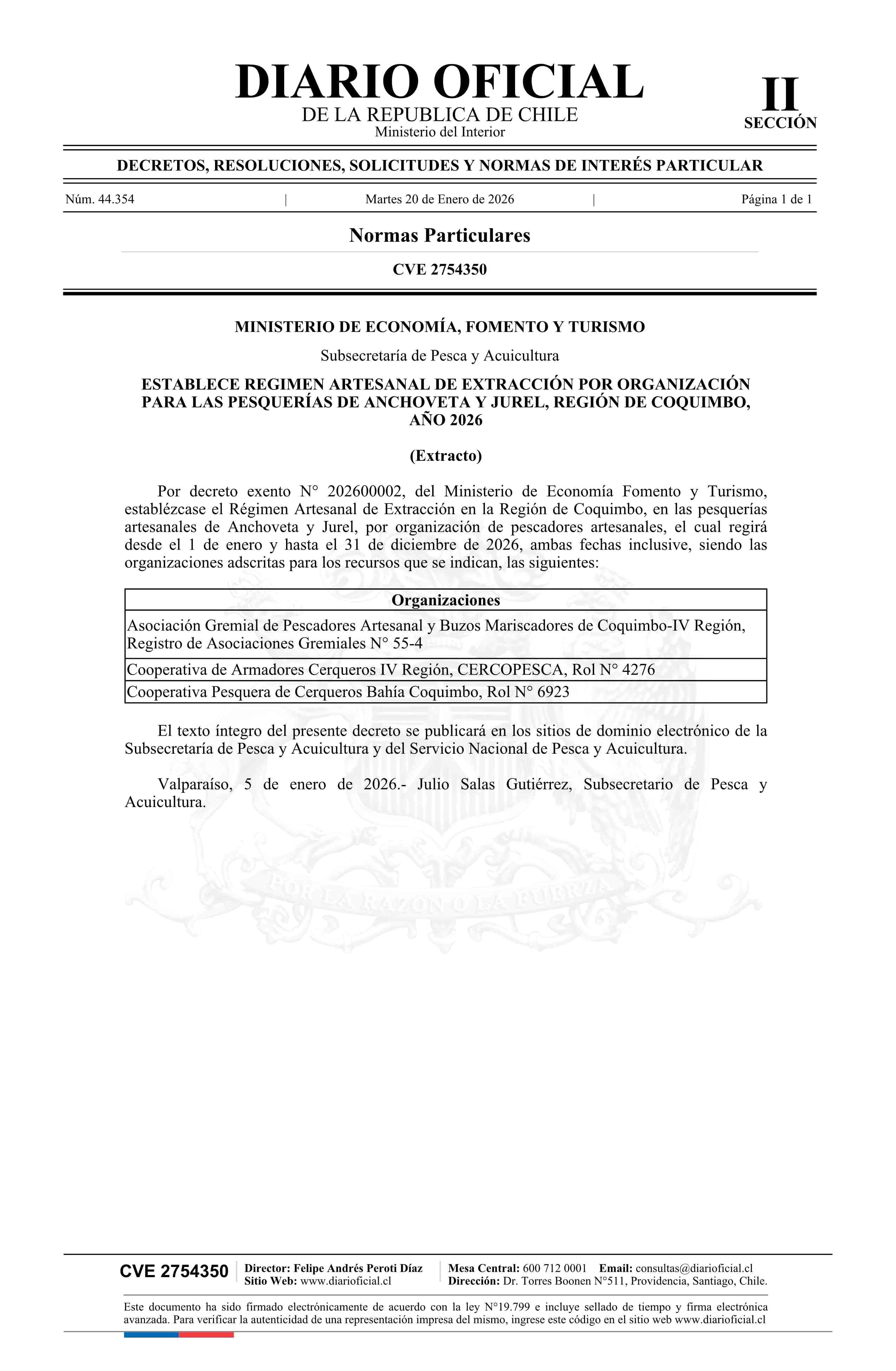 Extracto de decreto exento número 202600002, de 2026.- Establece régimen artesanal de extracción por organización para las pesquerías de Anchoveta y Jurel, Región de Coquimbo, año 2026 20-01-2026 Diario Oficial Edición Electrónica |