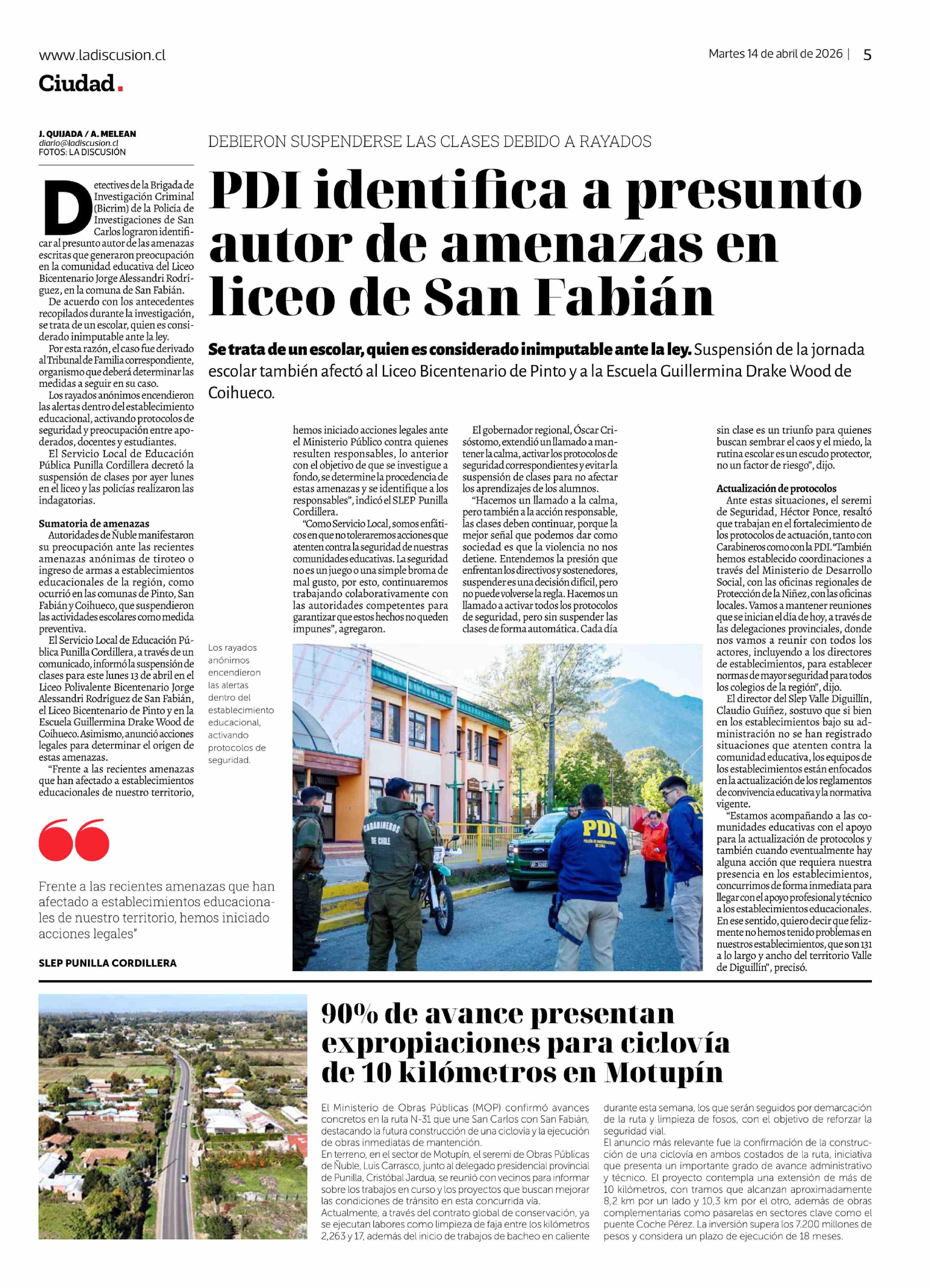 PDI identifica a presunto autor de amenazas en liceo de San Fabián 14-04-2026 La Discusión |