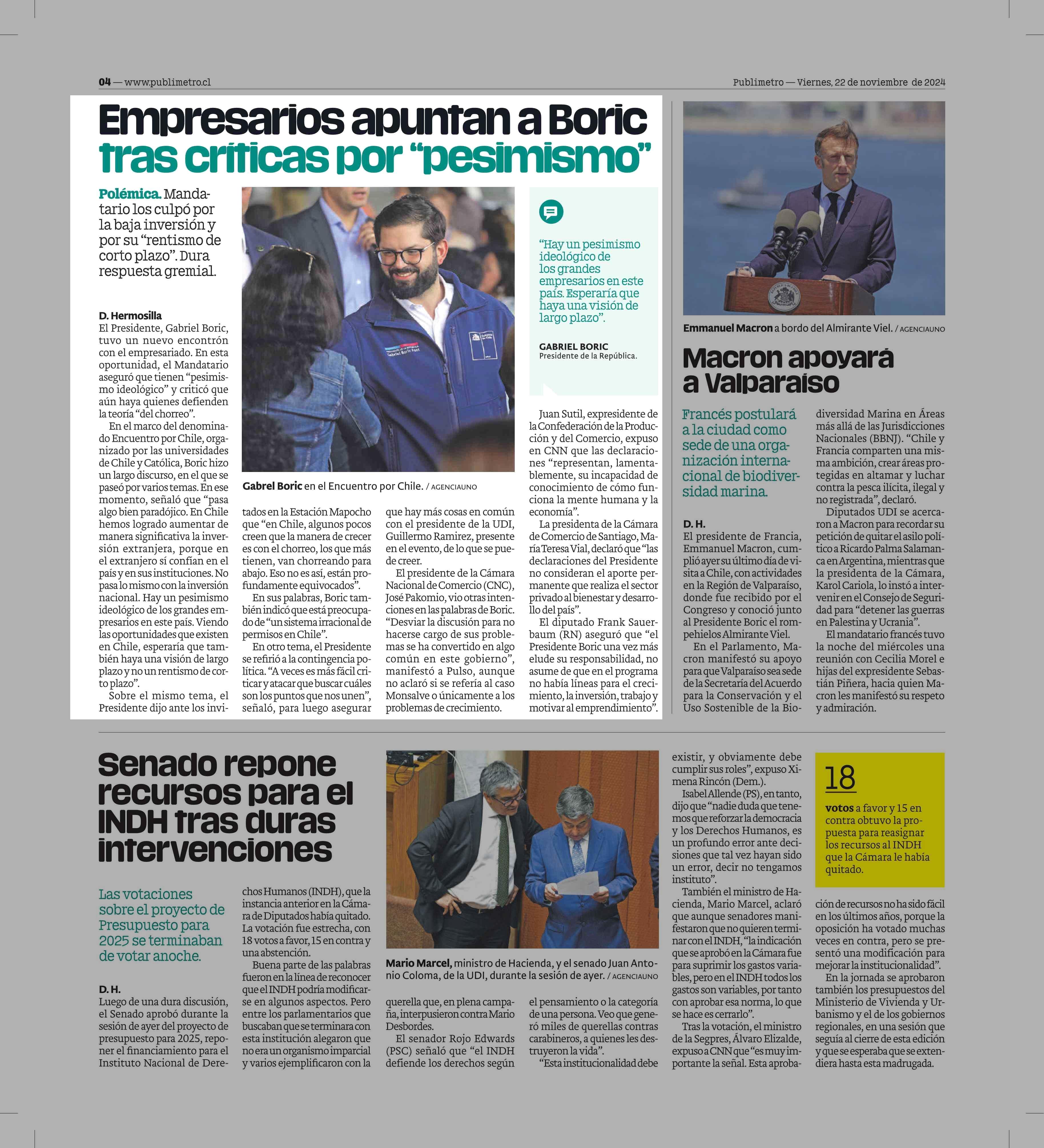 Empresarios apuntan a Boric tras críticas por "pesimismo" 22-11-2024 Publimetro |