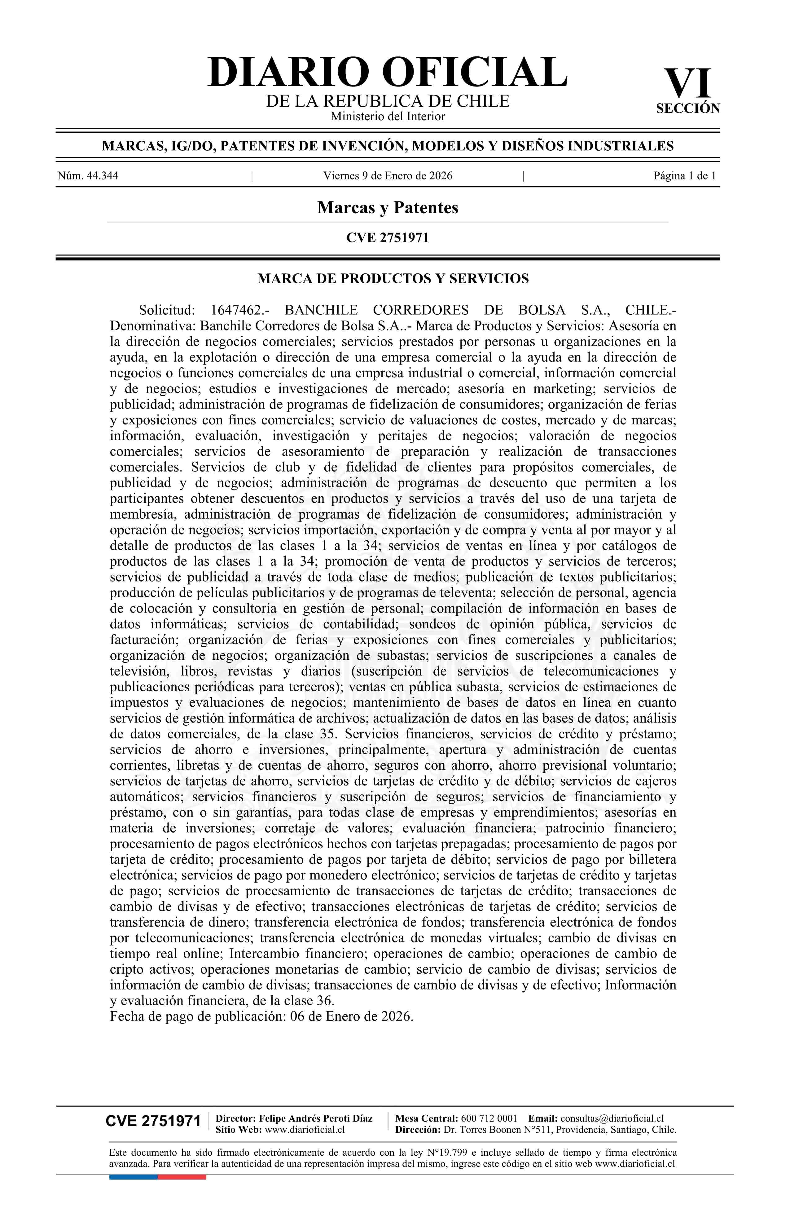 Solicitud número 1647462.- Banchile Corredores de Bolsa S.A. 09-01-2026 Diario Oficial Edición Electrónica |