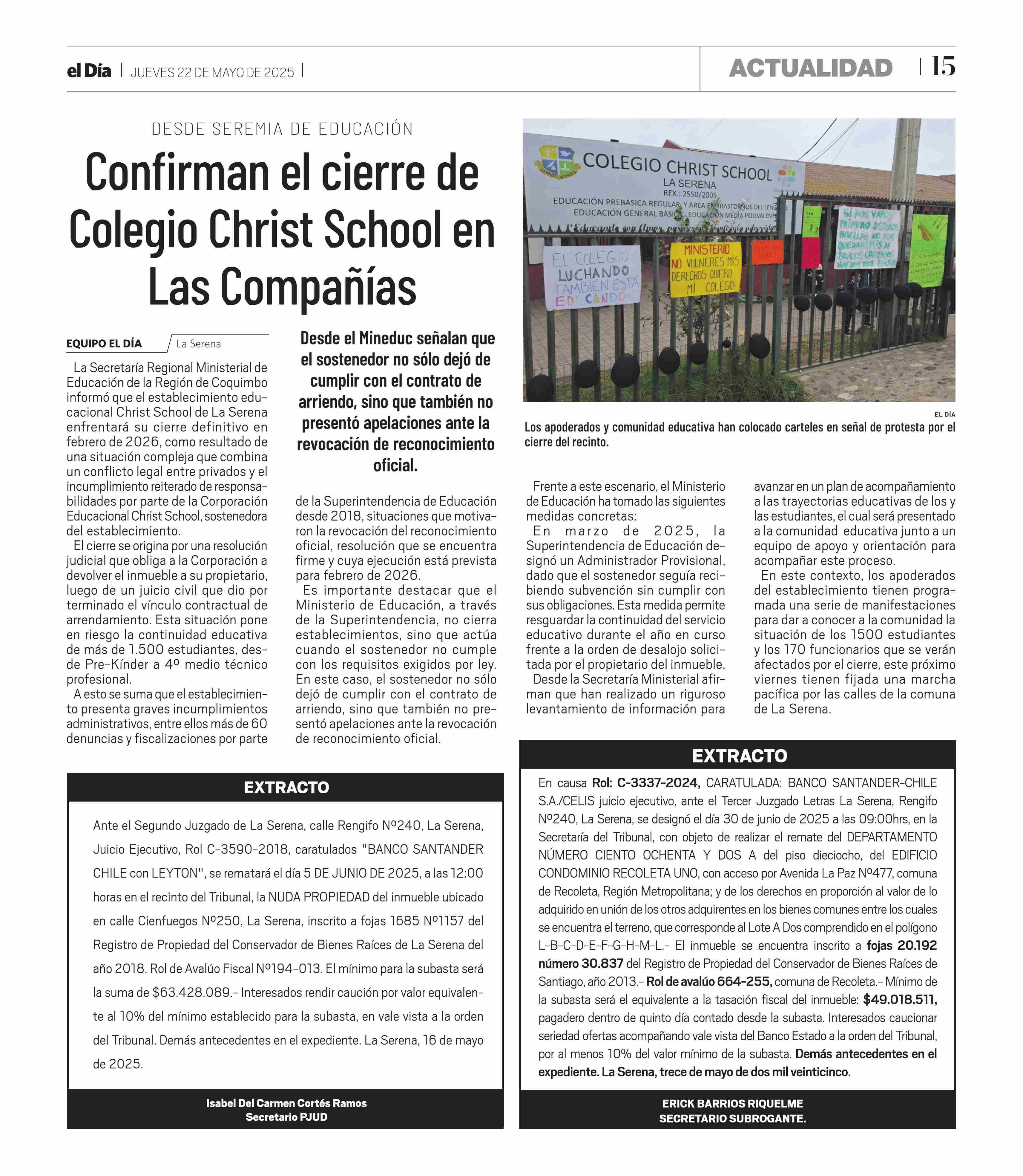 Confirman el cierre de Colegio Christ School en Las Compañías 22-05-2025 El Día |
