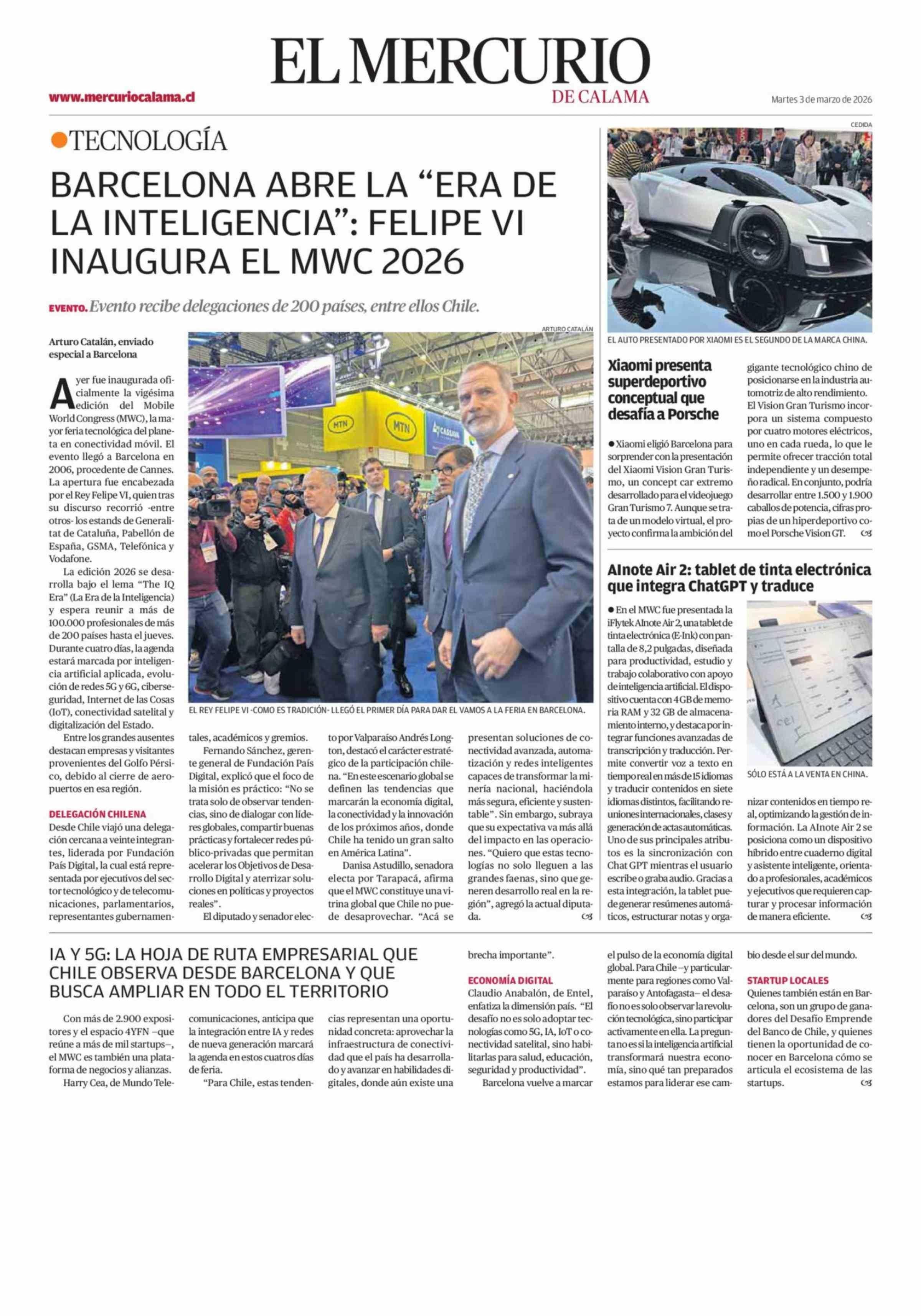 IA Y 5G: LA HOJA DE RUTA EMPRESARIAL QUE CHILE OBSERVA DESDE BARCELONA Y QUE BUSCA AMPLIAR EN TODO EL TERRITORIO 03-03-2026 El Mercurio de Calama |