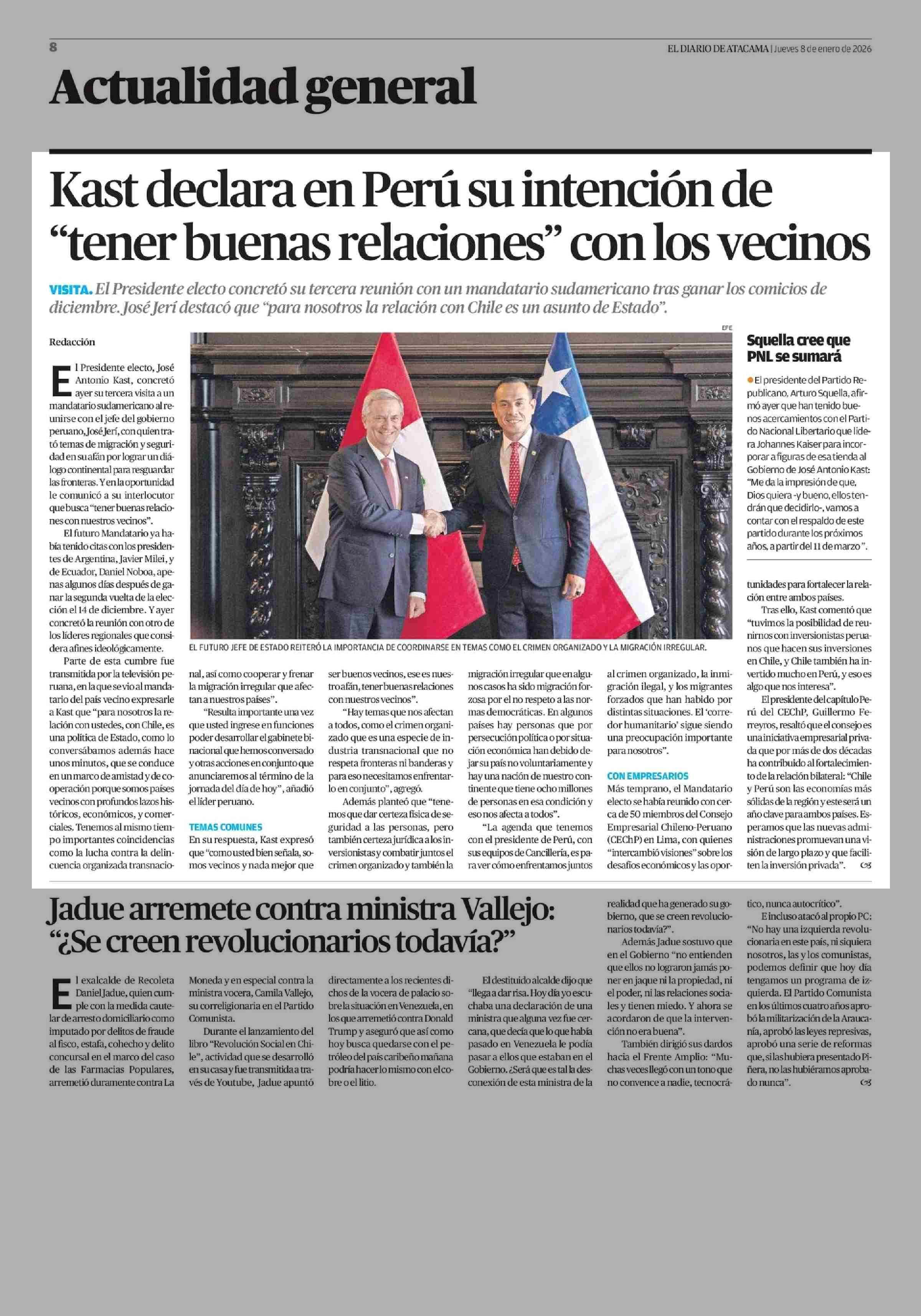 Kast declara en Perú su intención de "tener buenas relaciones" con los vecinos 08-01-2026 El Diario de Atacama |