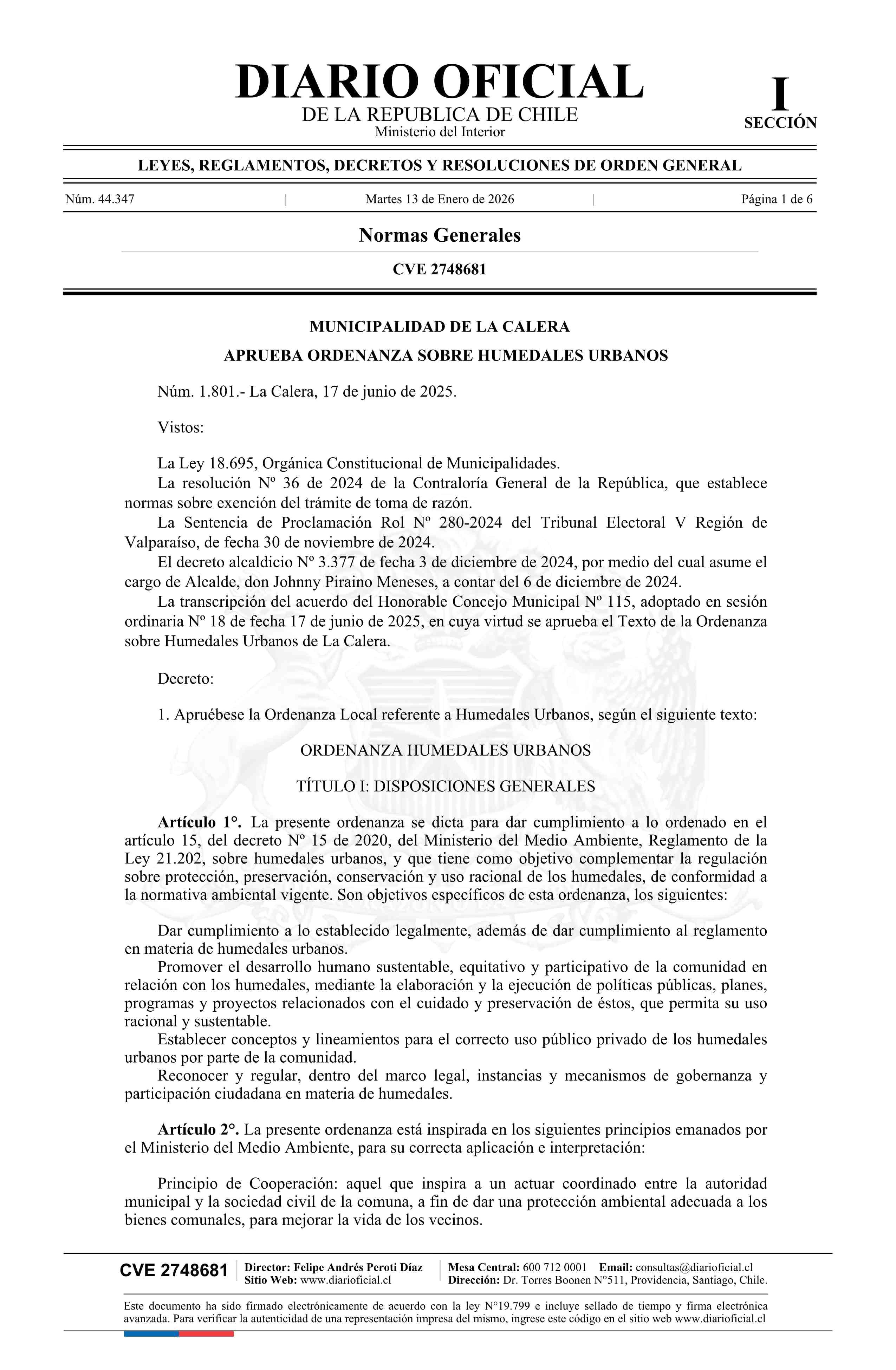 Título: Decreto alcaldicio número 1.801, de 2025.- Aprueba Ordenanza sobre humedades urbanos