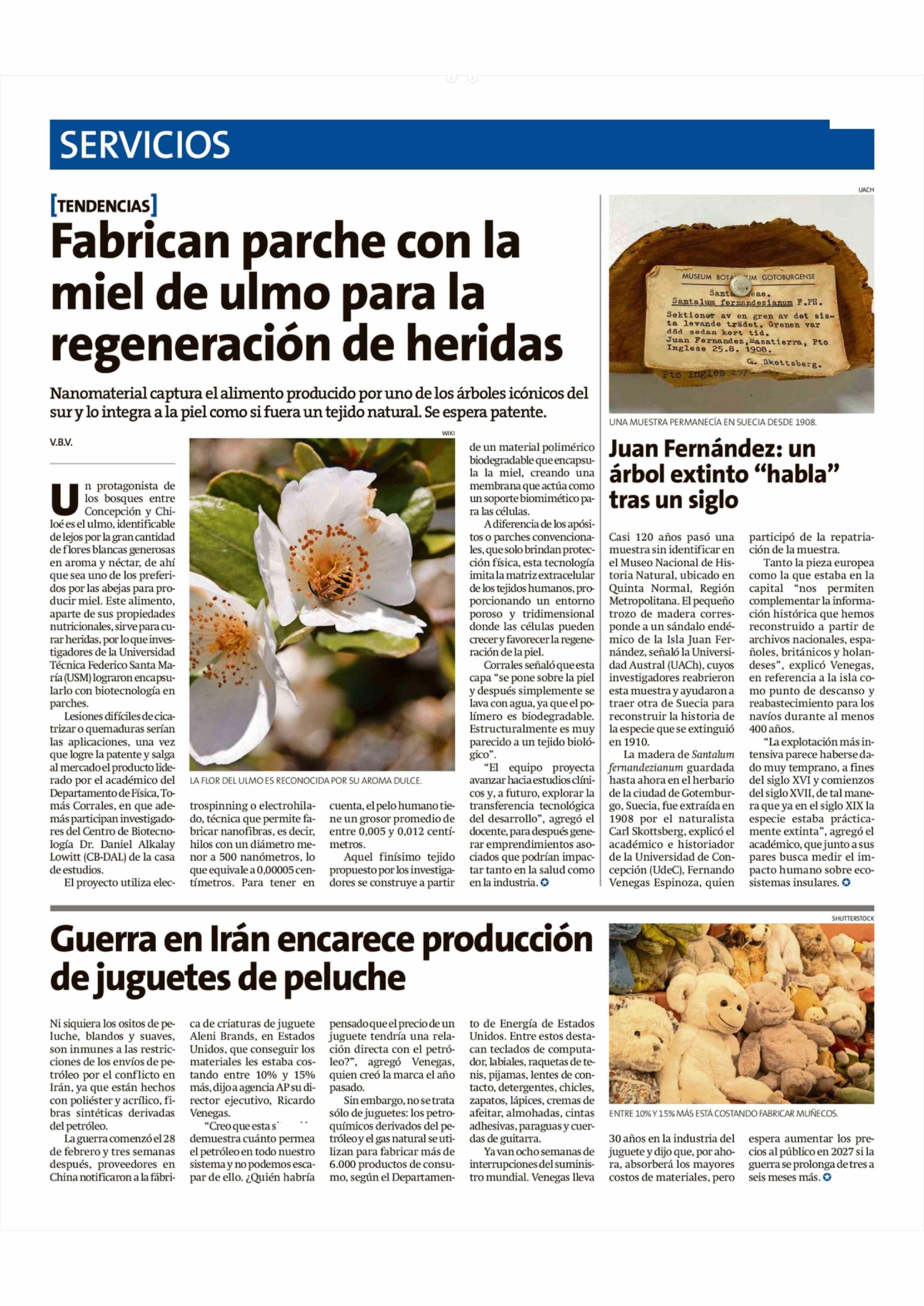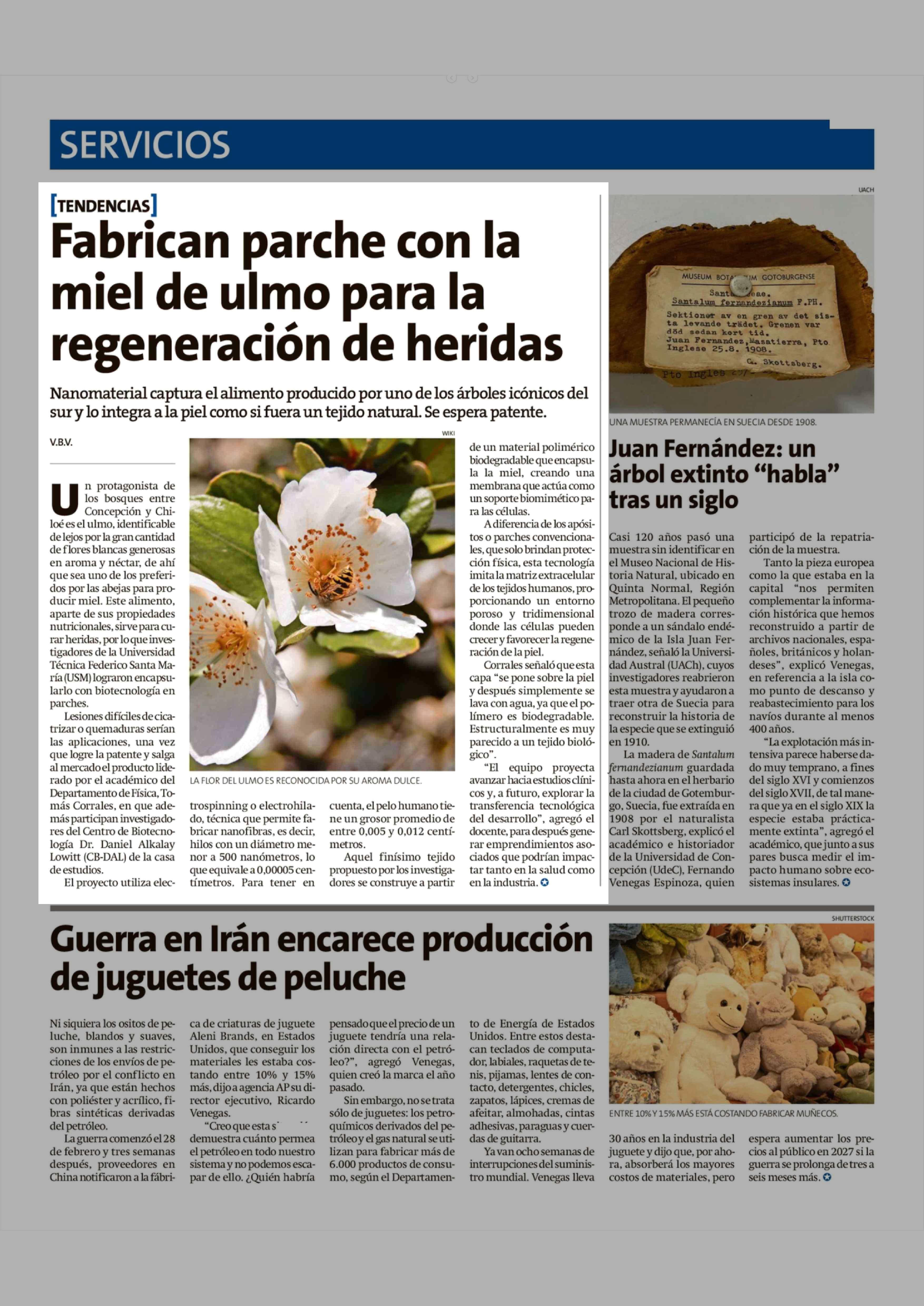 Fabrican parche con la miel de ulmo para la regeneración de heridas 27-04-2026 La Estrella de Chiloé |