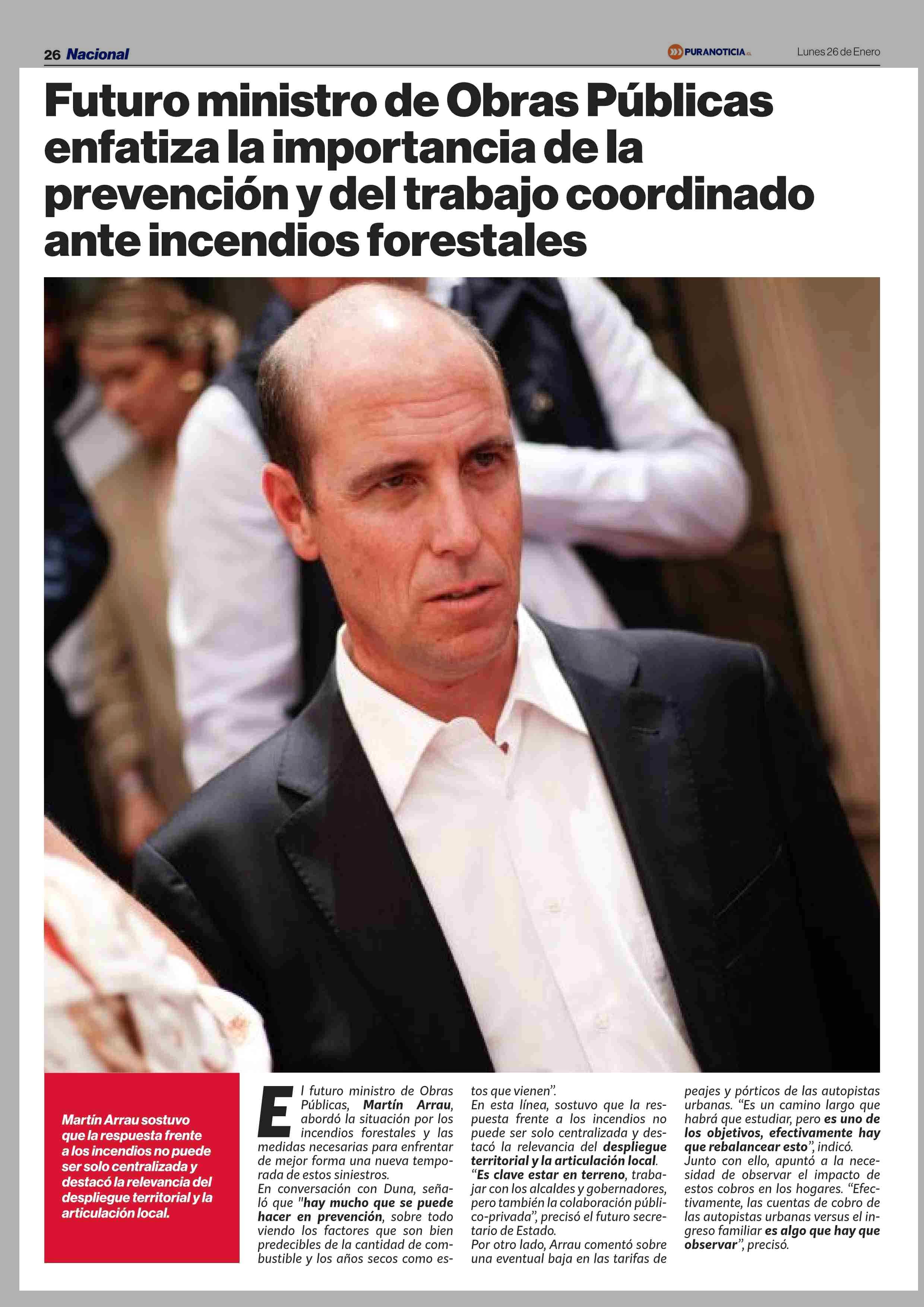 Futuro ministro de Obras Públicas enfatiza la importancia de la prevención y del trabajo coordinado ante incendios forestales 26-01-2026 Puranoticia.cl |