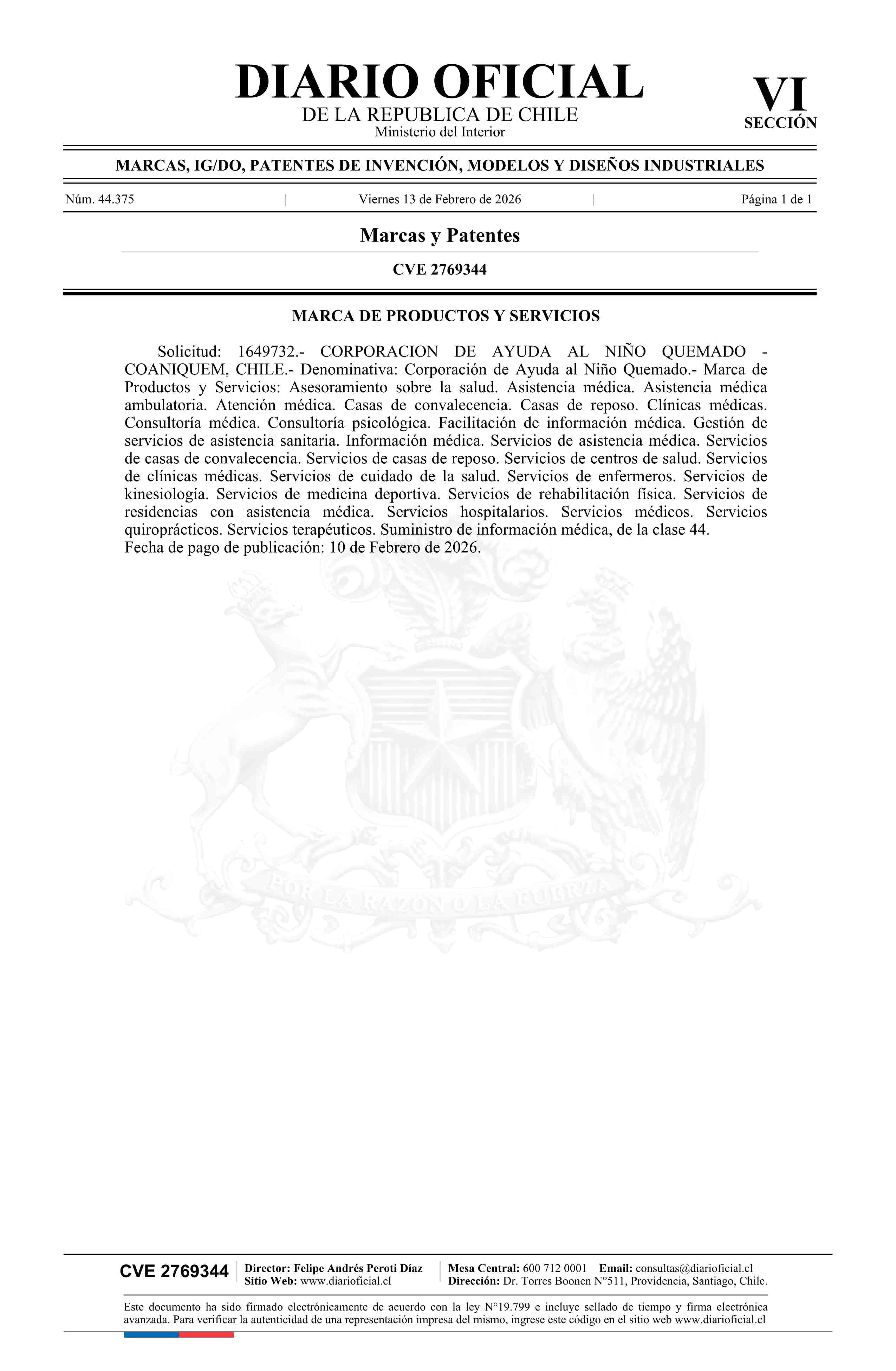 Solicitud número 1649732.- Corporación de Ayuda al Niño Quemado 13-02-2026 Diario Oficial Edición Electrónica |