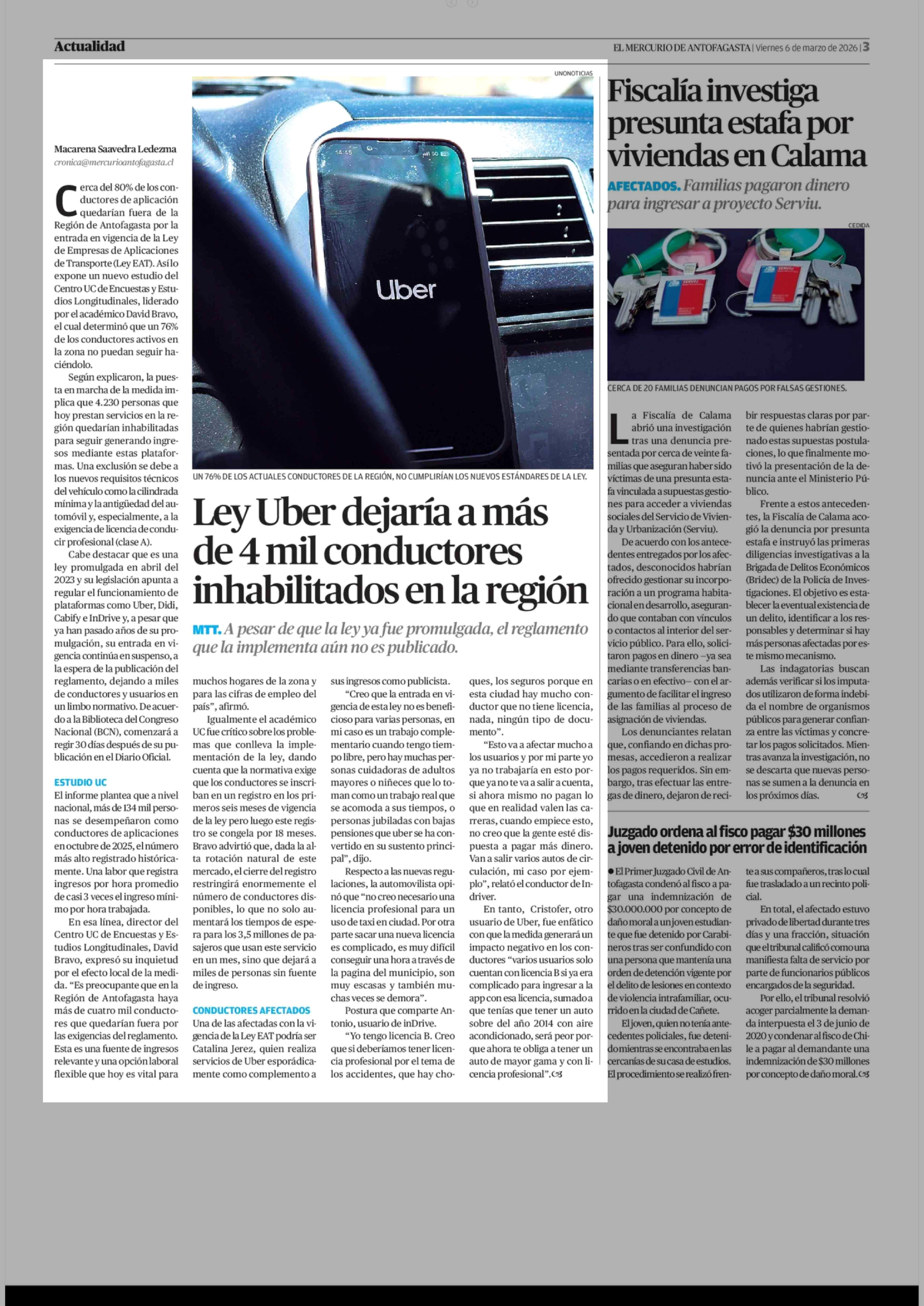 Ley Uber dejaría a más de 4 mil conductores inhabilitados en la región 06-03-2026 El Mercurio de Antofagasta |