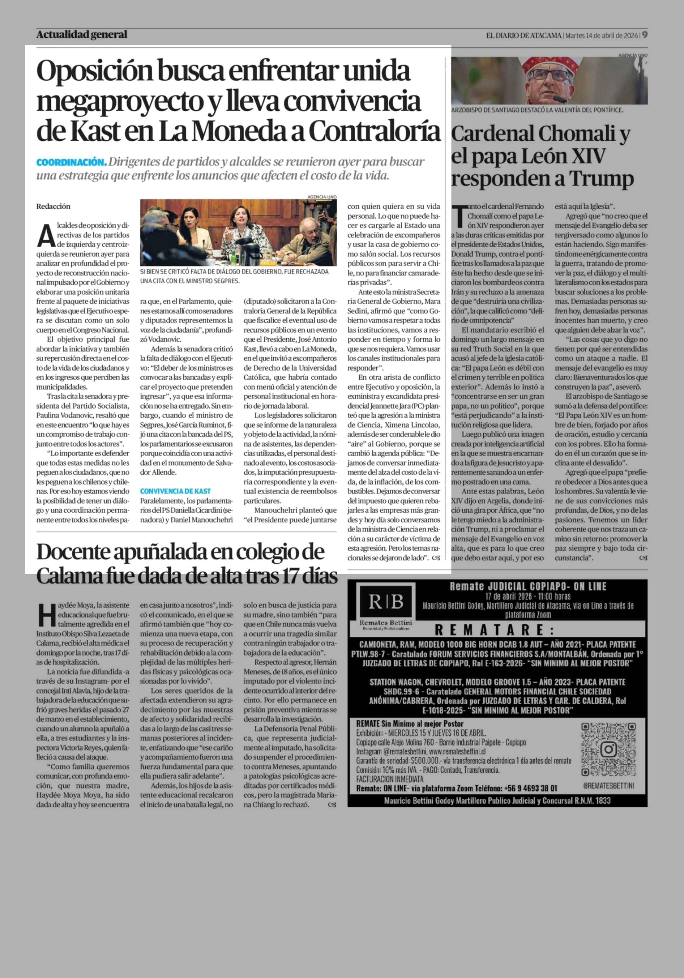 Oposición busca enfrentar unida megaproyecto y lleva convivencia de Kast en La Moneda a Contraloría 14-04-2026 El Diario de Atacama |