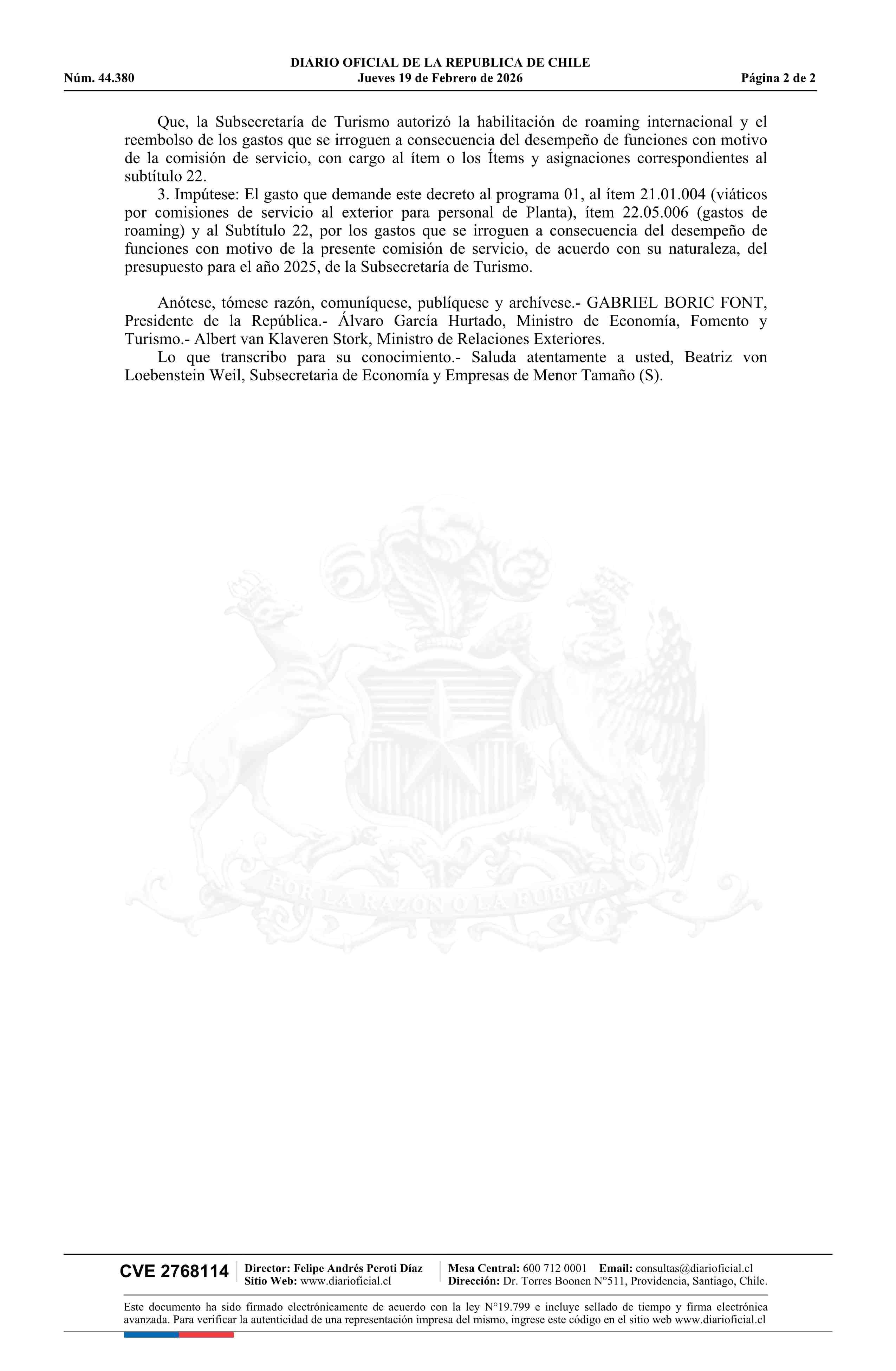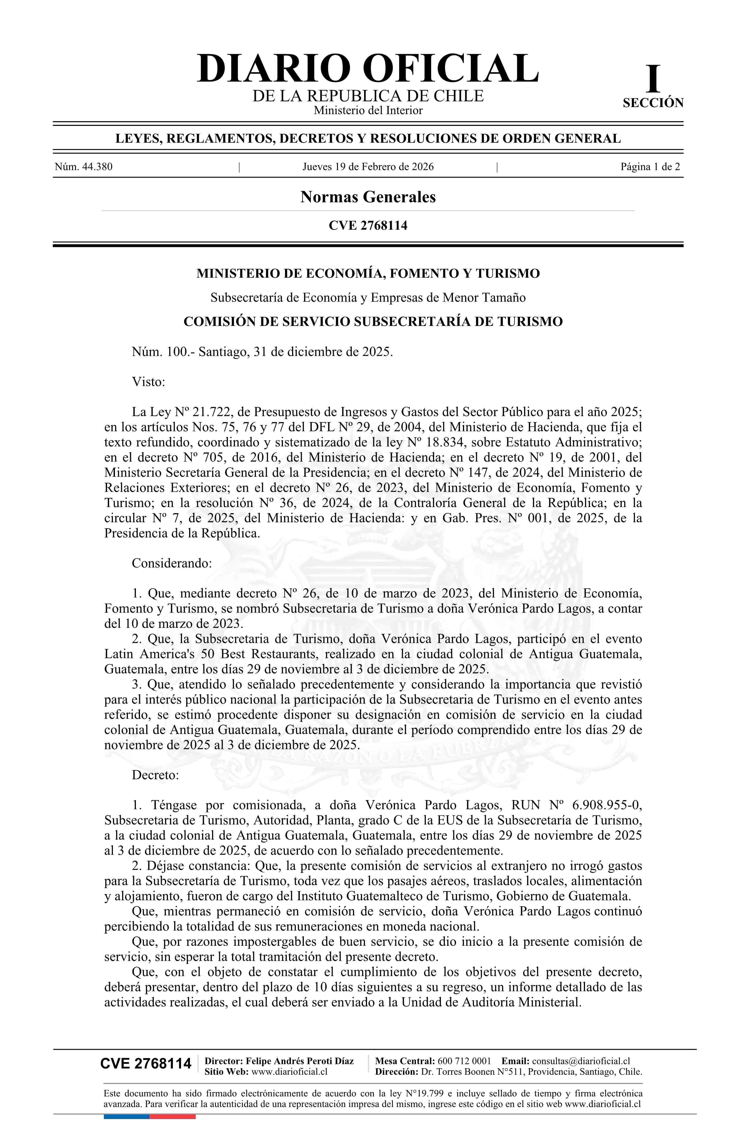 Decreto número 100, de 2025.- Designa en comisión de servicio a doña Verónica Pardo Lagos, Subsecretaria de Turismo, a la ciudad de Antigua Guatemala, Guatemala 19-02-2026 Diario Oficial Edición Electrónica |