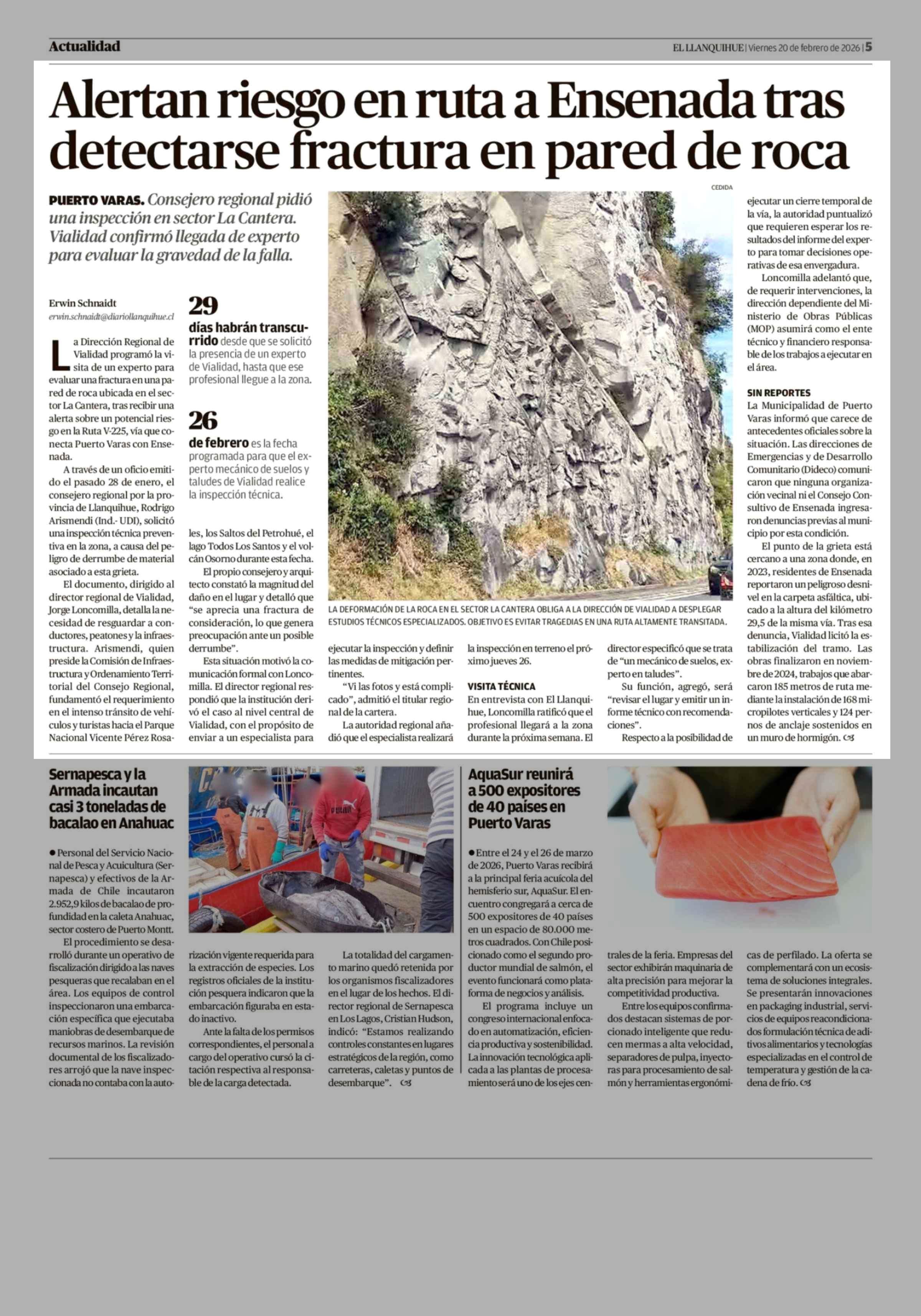 Alertan riesgo en ruta a Ensenada tras detectarse fractura en pared de roca 20-02-2026 El Llanquihue |