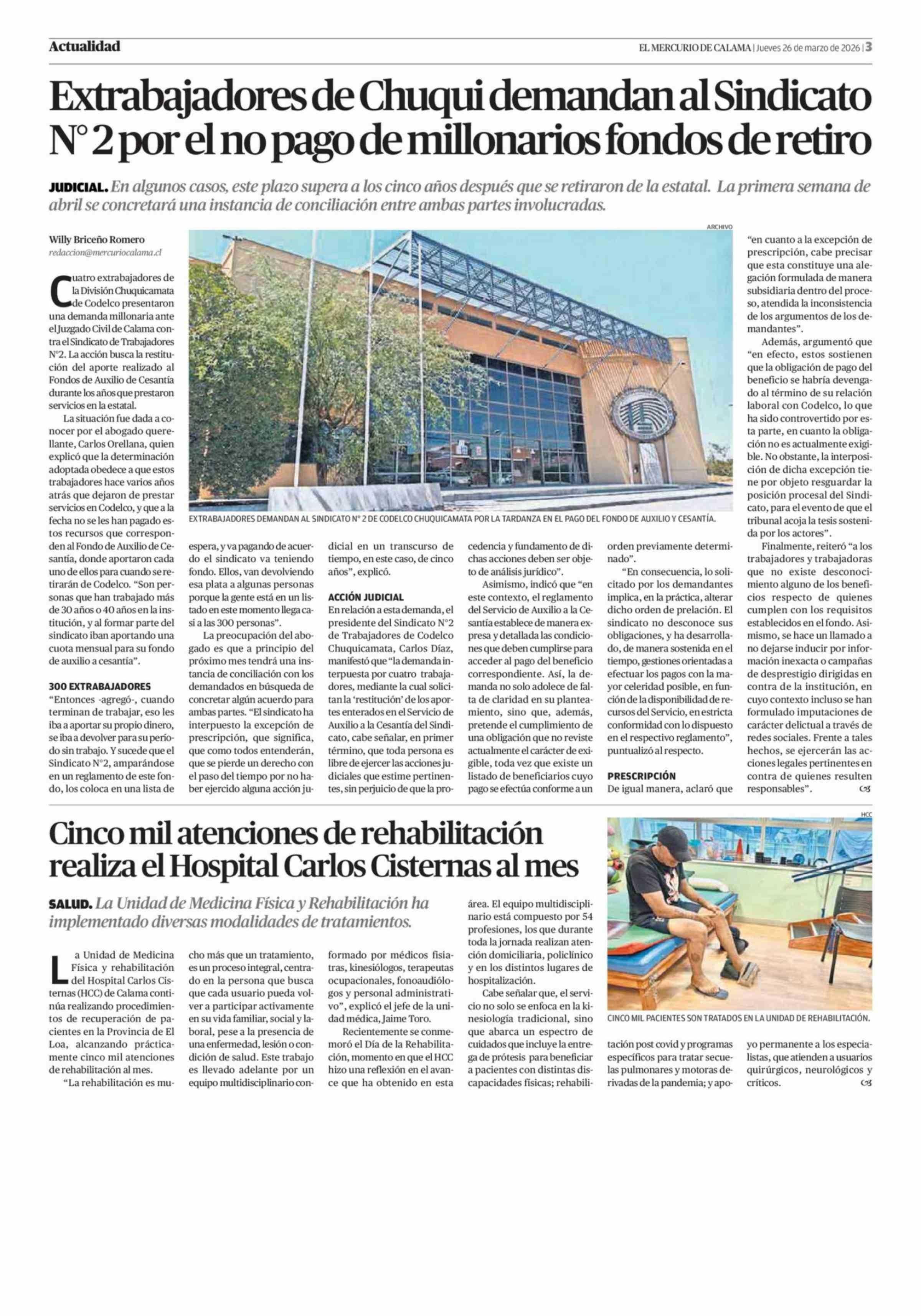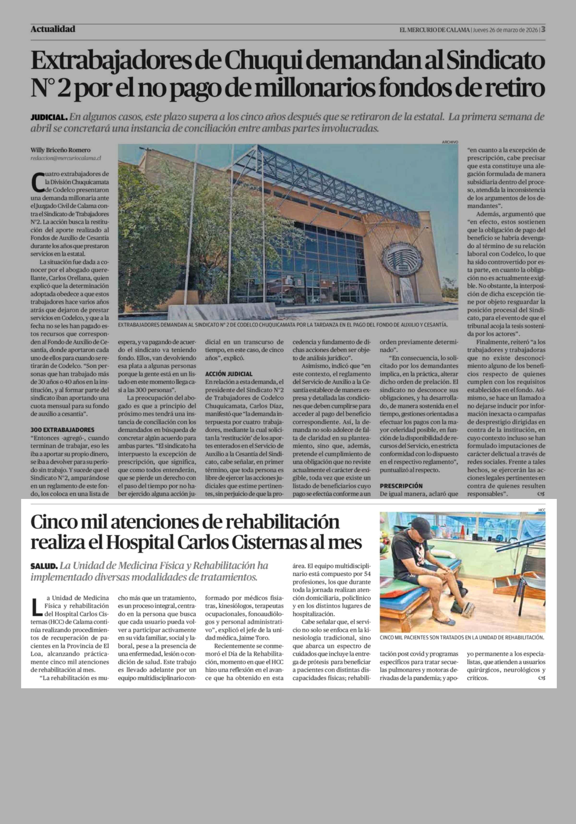Cinco mil atenciones de rehabilitación realiza el Hospital Carlos Cisternas al mes 26-03-2026 El Mercurio de Calama |