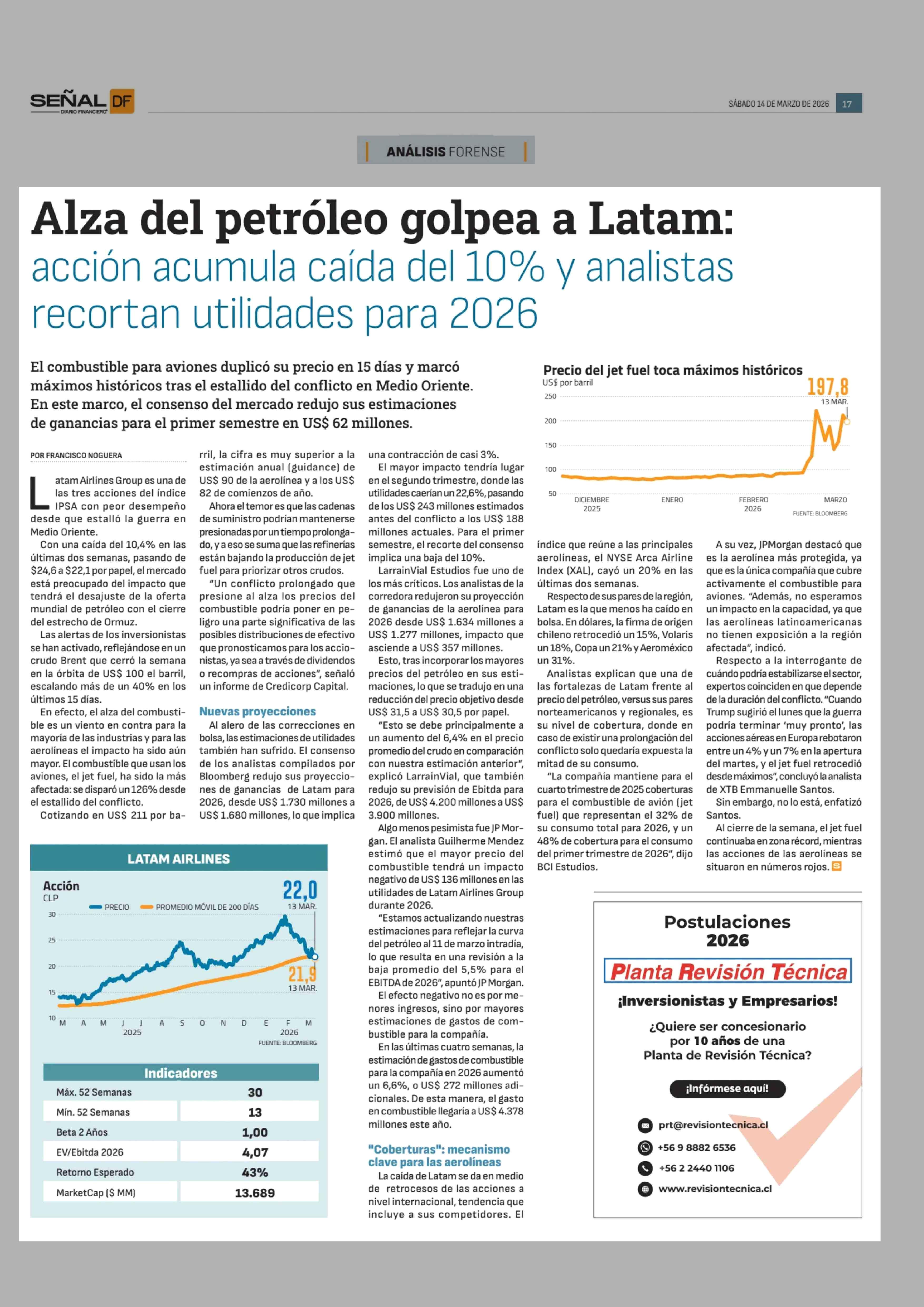 Título: Alza del petróleo golpea a Latam: acción acumula caída del 10% y analistas recortan utilidades para 2026