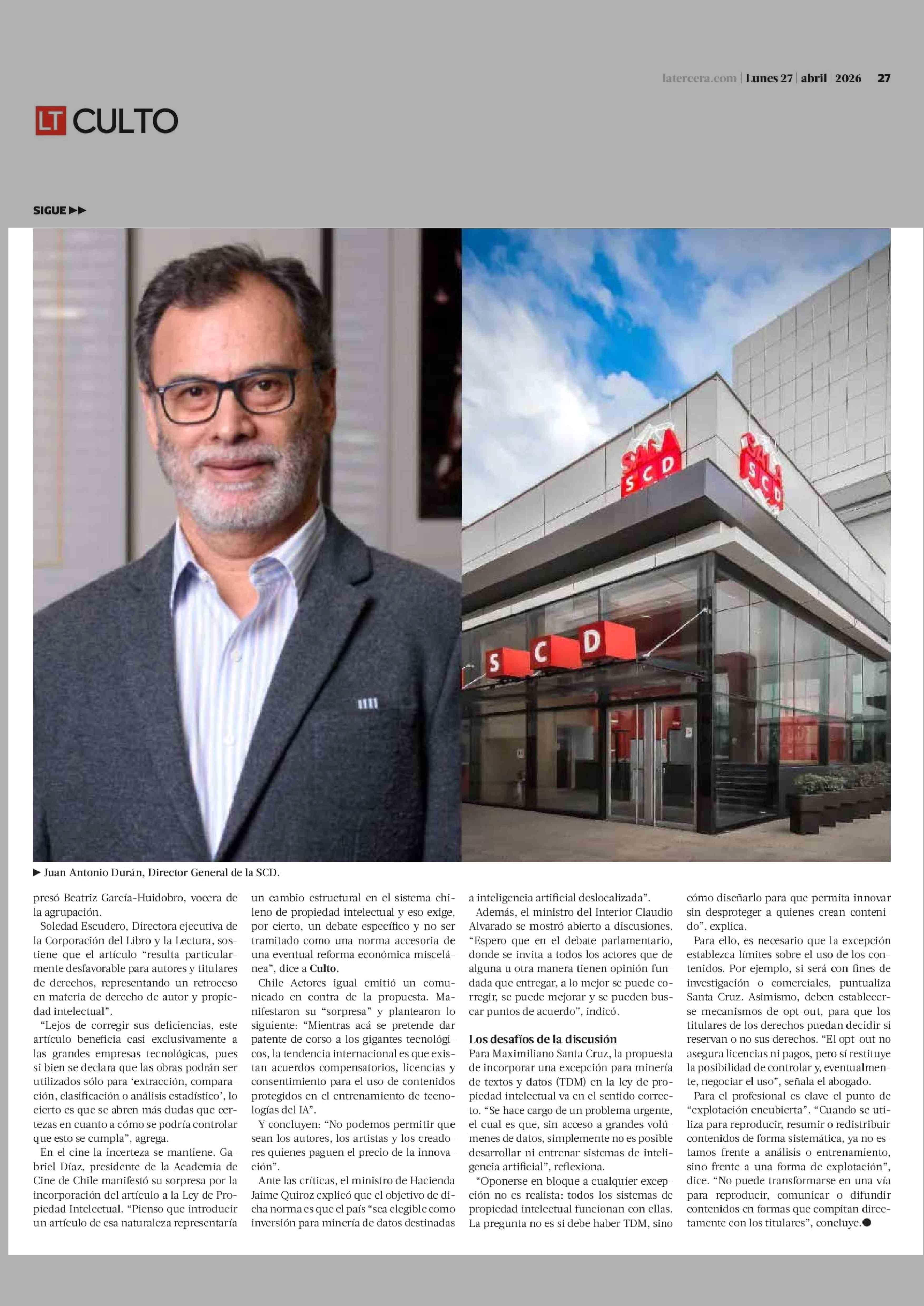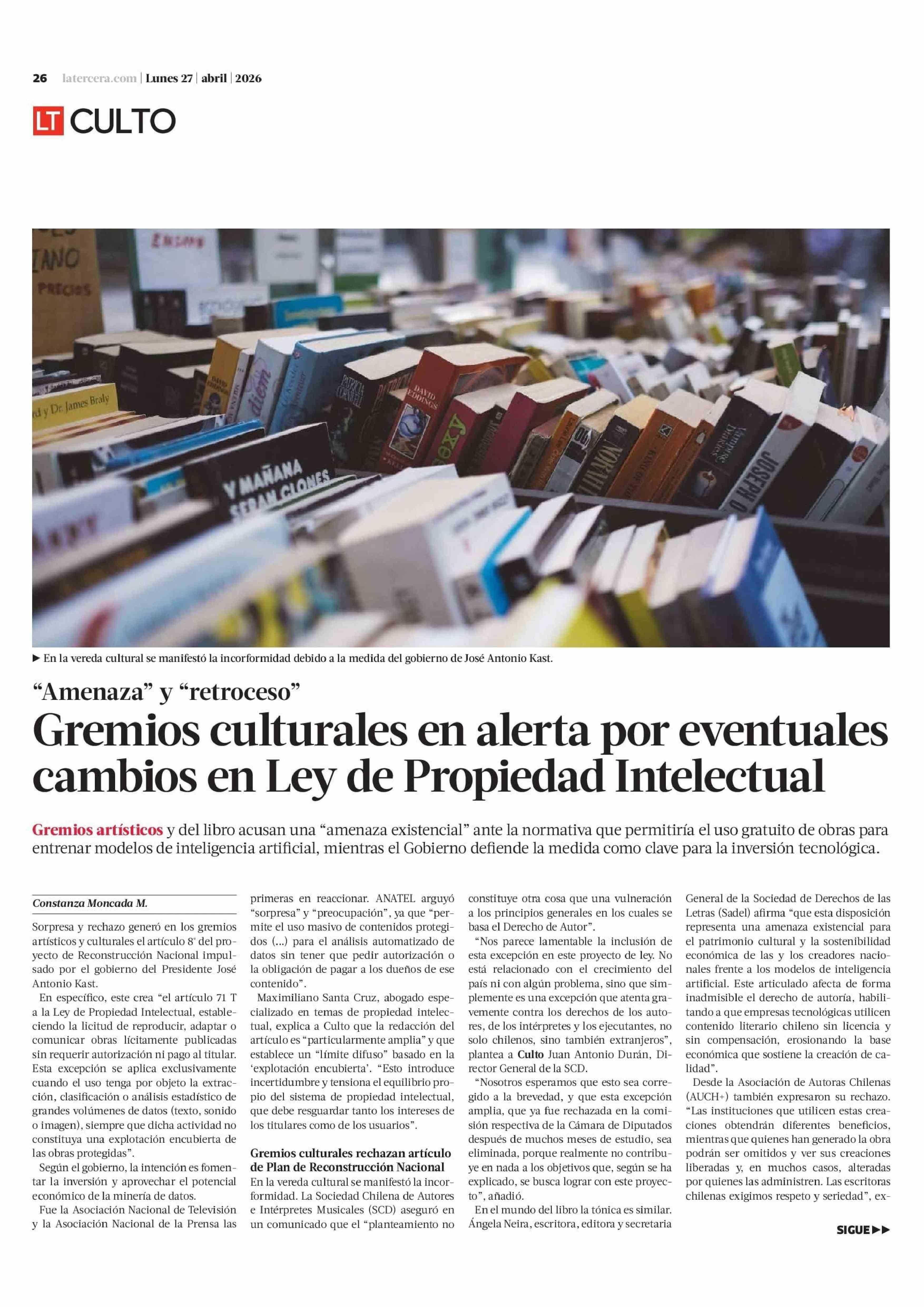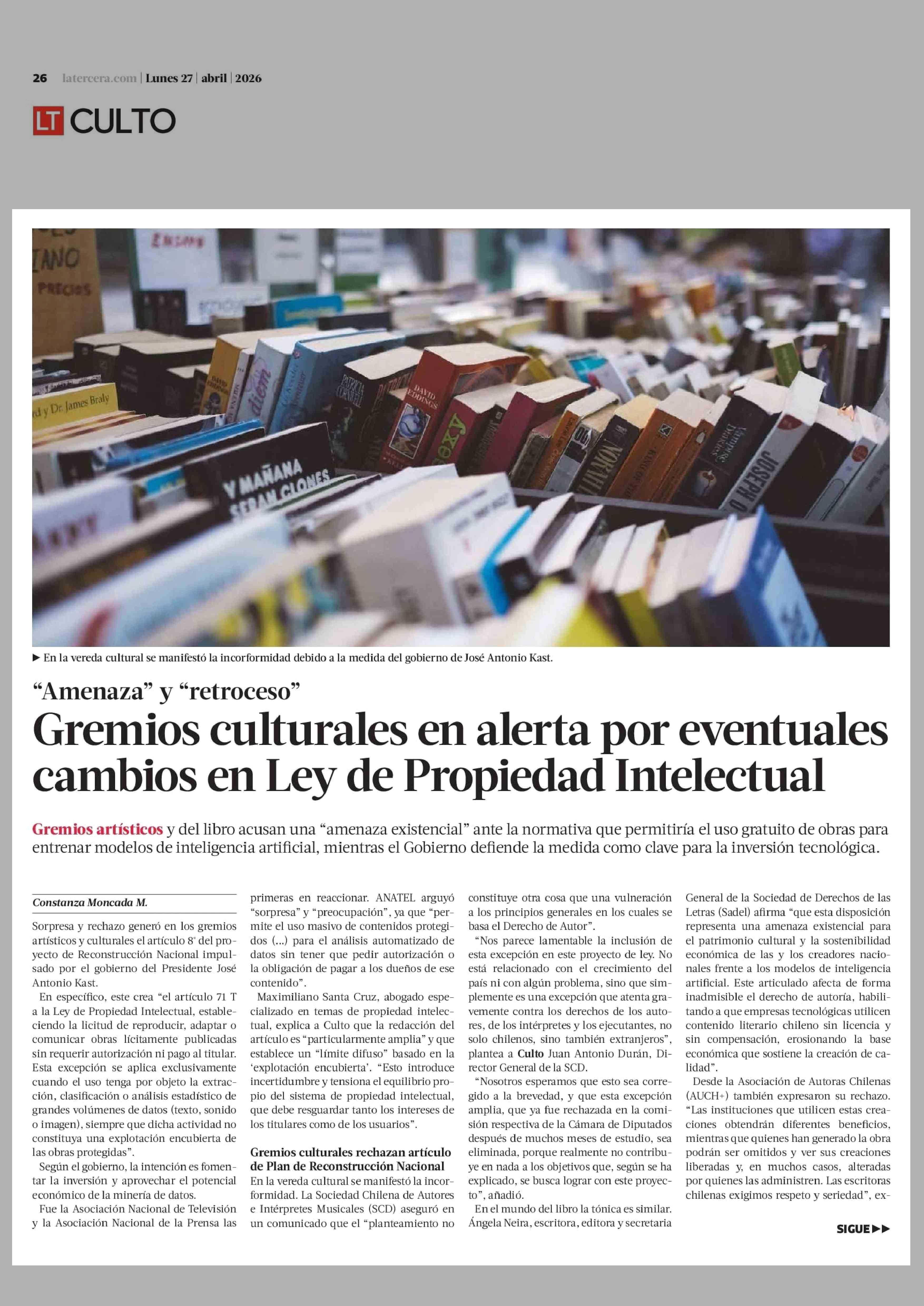 Gremios culturales en alerta por eventuales cambios en Ley de Propiedad Intelectual 27-04-2026 La Tercera |