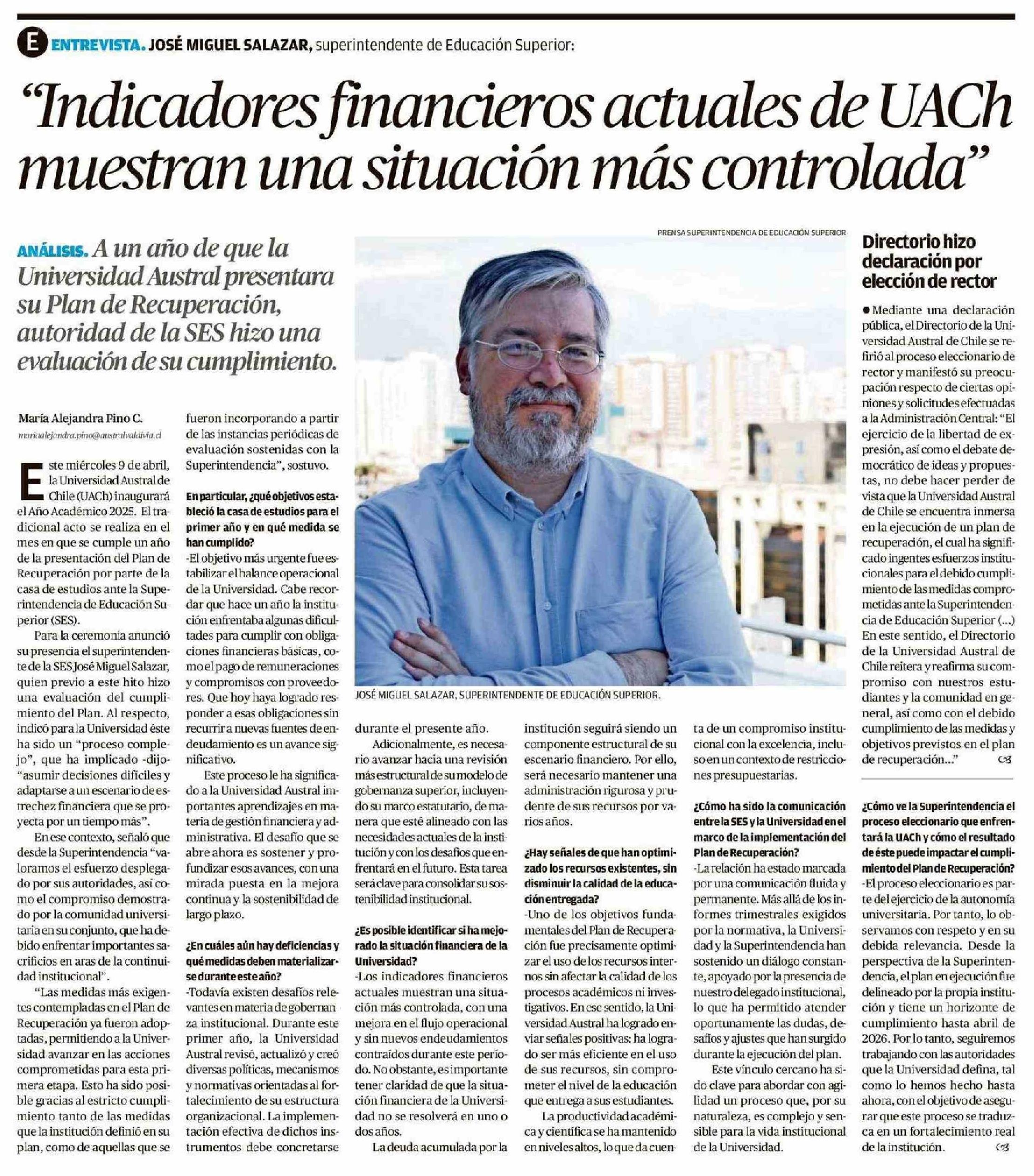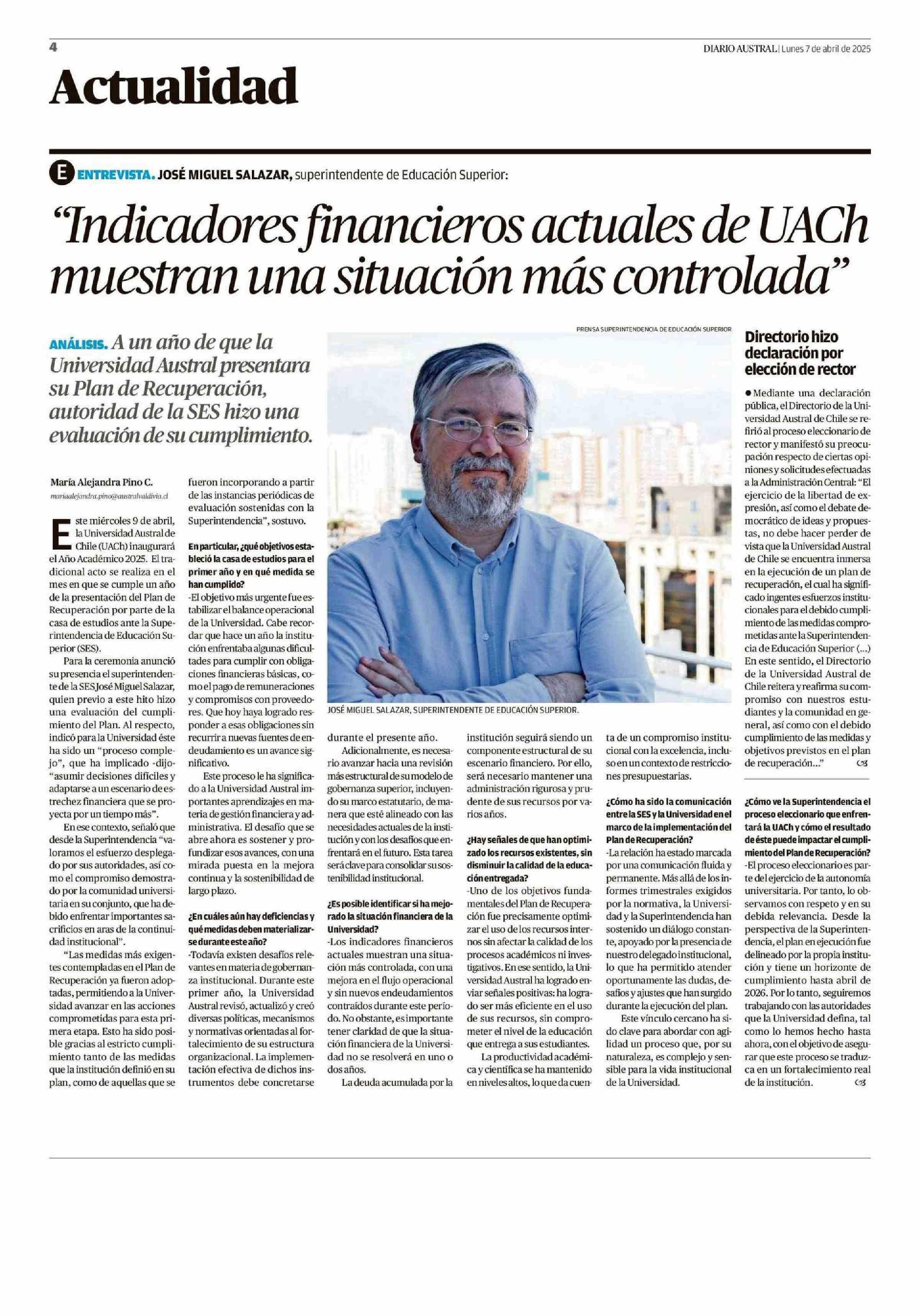 “Indicadores financieros actuales de UACh muestran una situación más controlada” 07-04-2025 Diario Austral Región de Los Ríos |