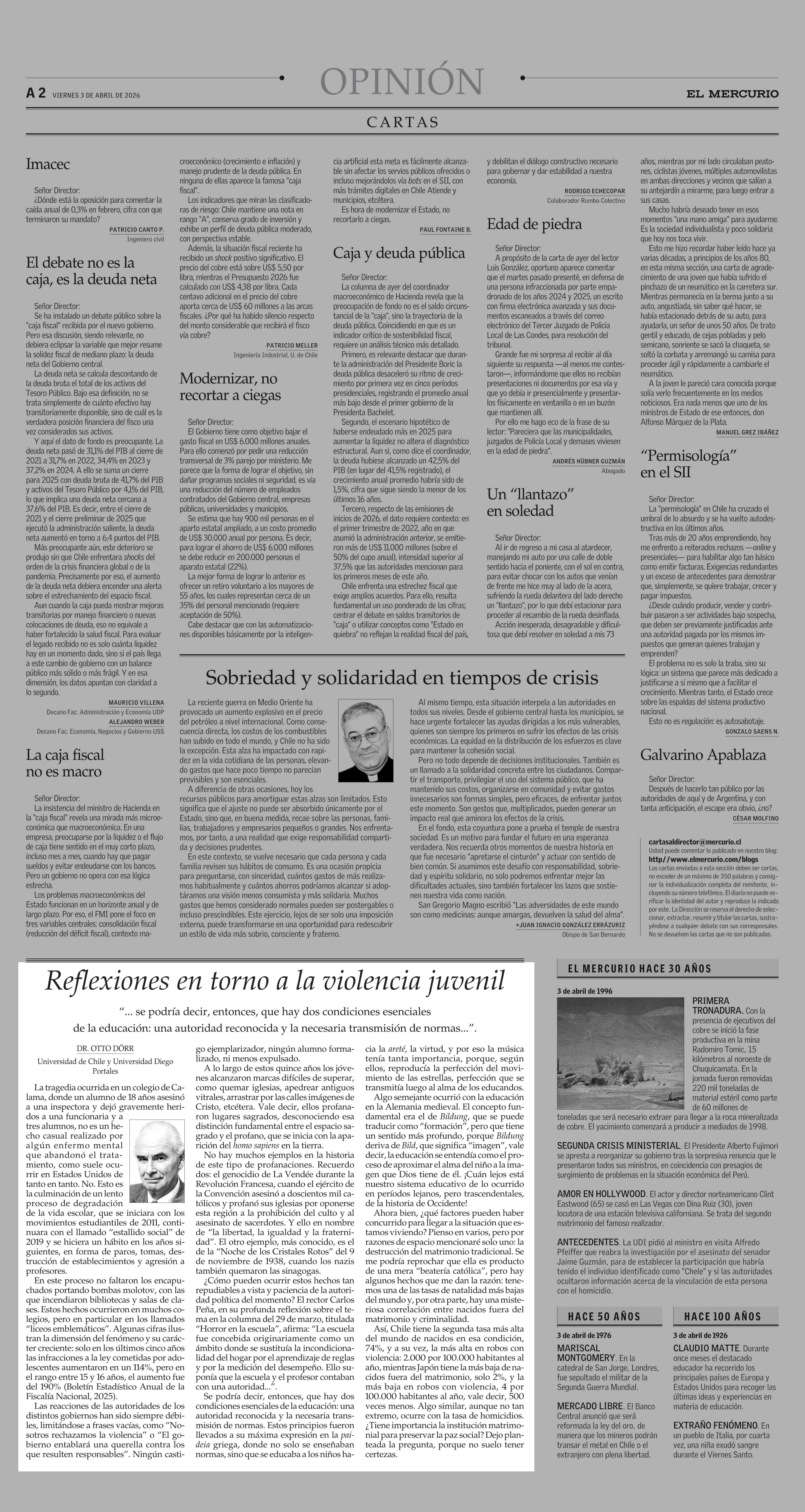 Columnas de Opinión: Reflexiones en torno a la violencia juvenil 03-04-2026 El Mercurio |
