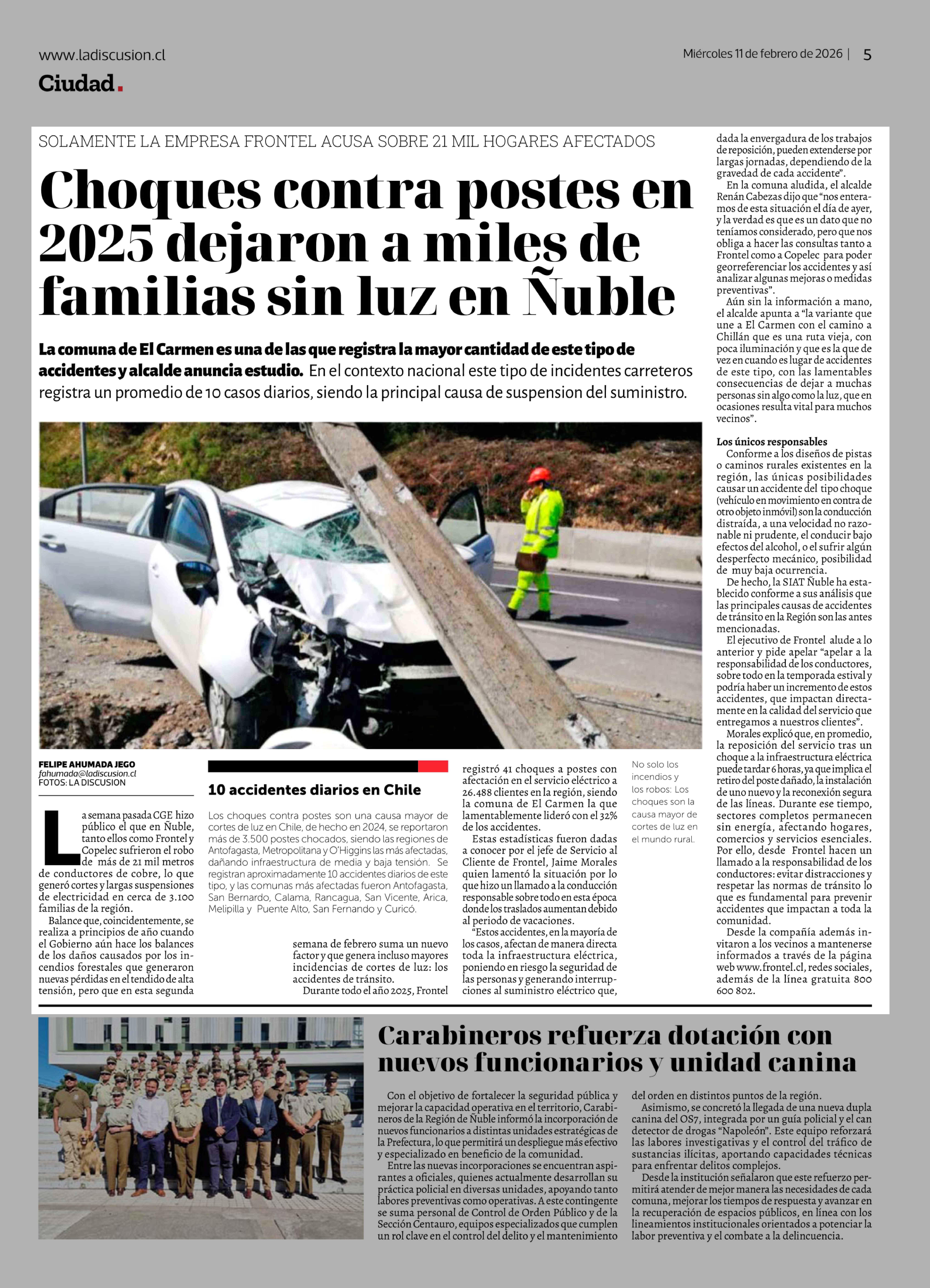 Choques contra postes en 2025 dejaron a miles de familias sin luz en Nuble 11-02-2026 La Discusión |