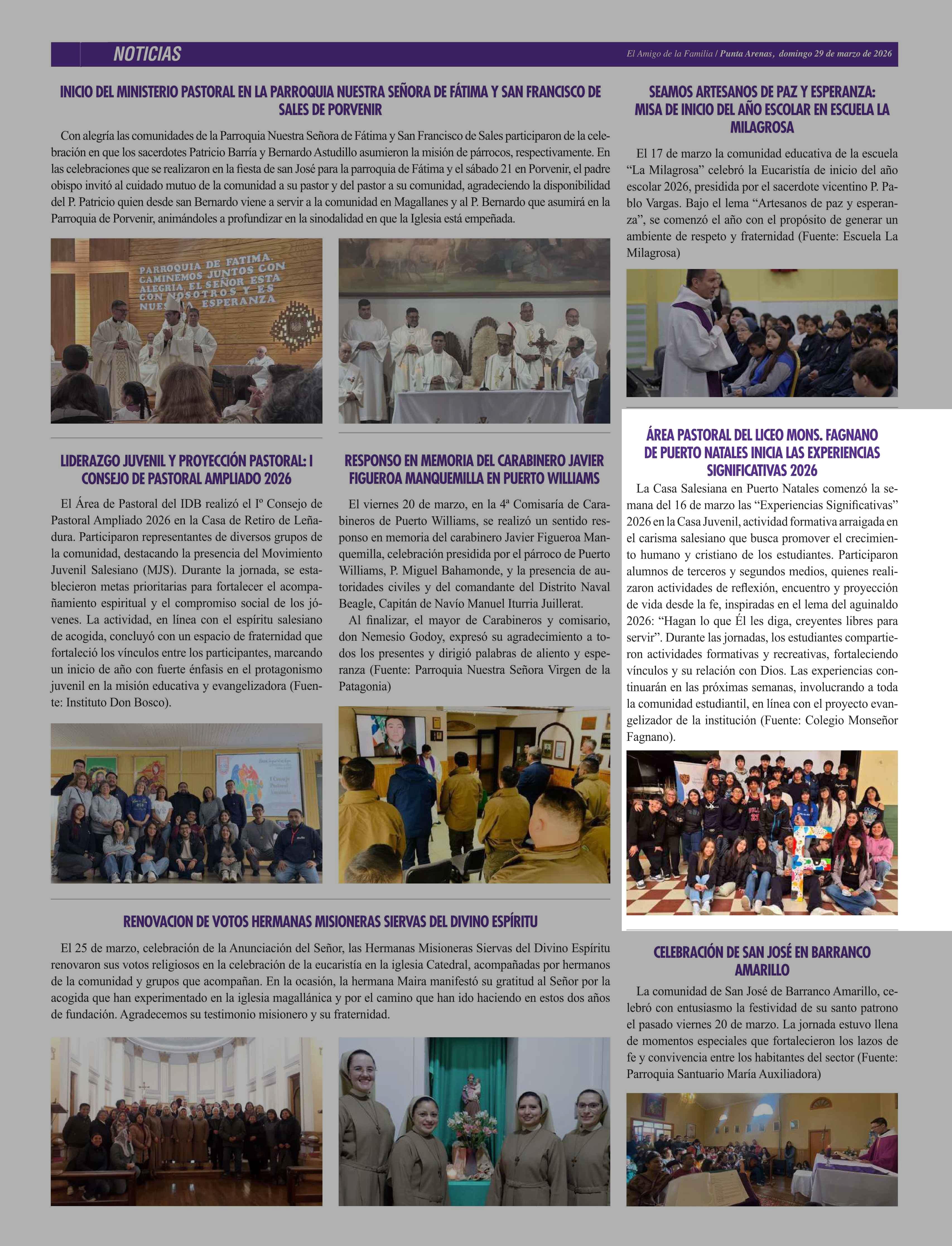 ÁREA PASTORAL DEL LICEO MONS. FAGNANO DE PUERTO NATALES INICIA LAS EXPERIENCIAS SIGNIFICATIVAS 2026 29-03-2026 El Pingüino |