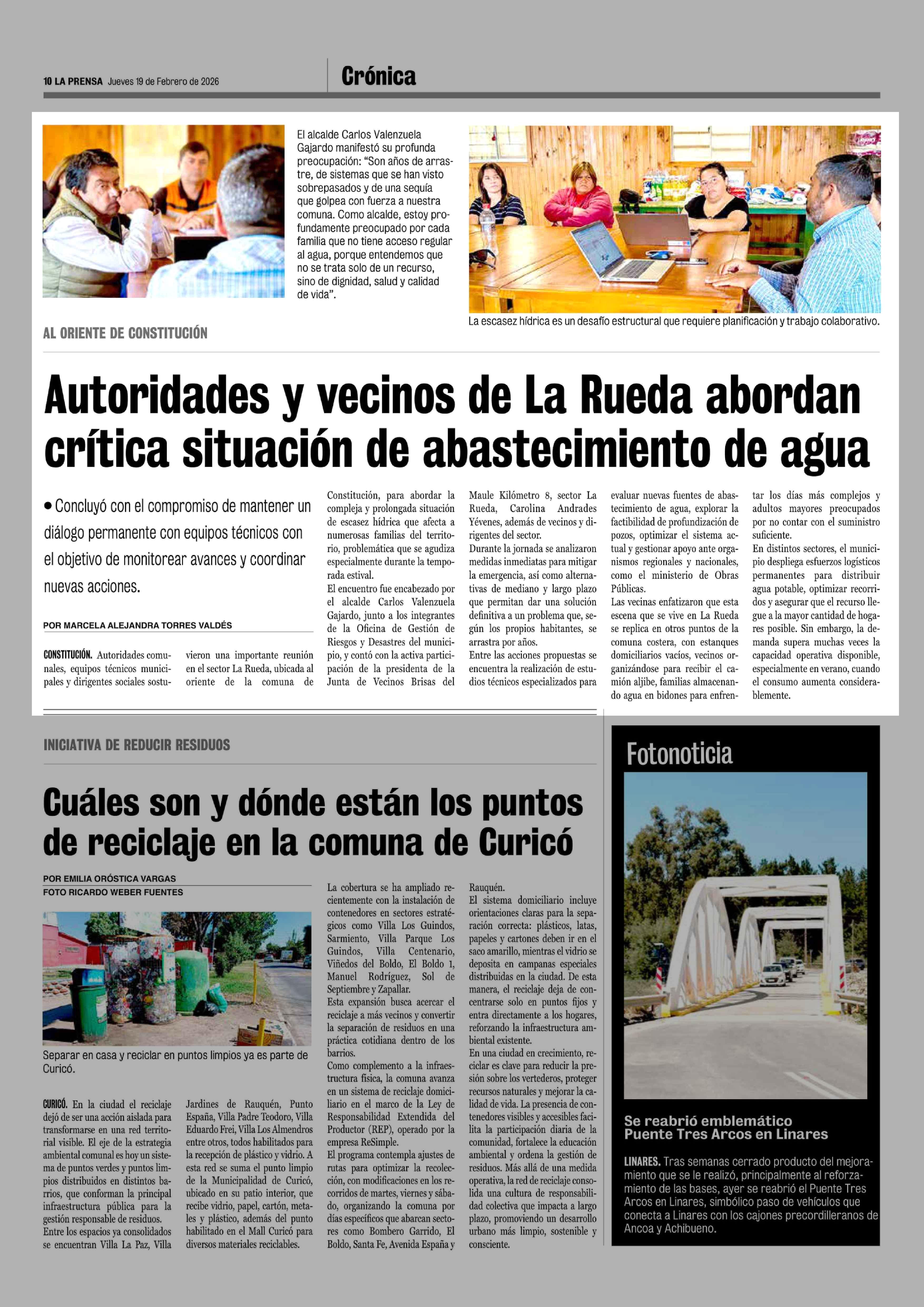 Autoridades y vecinos de La Rueda abordan crítica situación de abastecimiento de agua 19-02-2026 La Prensa de Curicó |