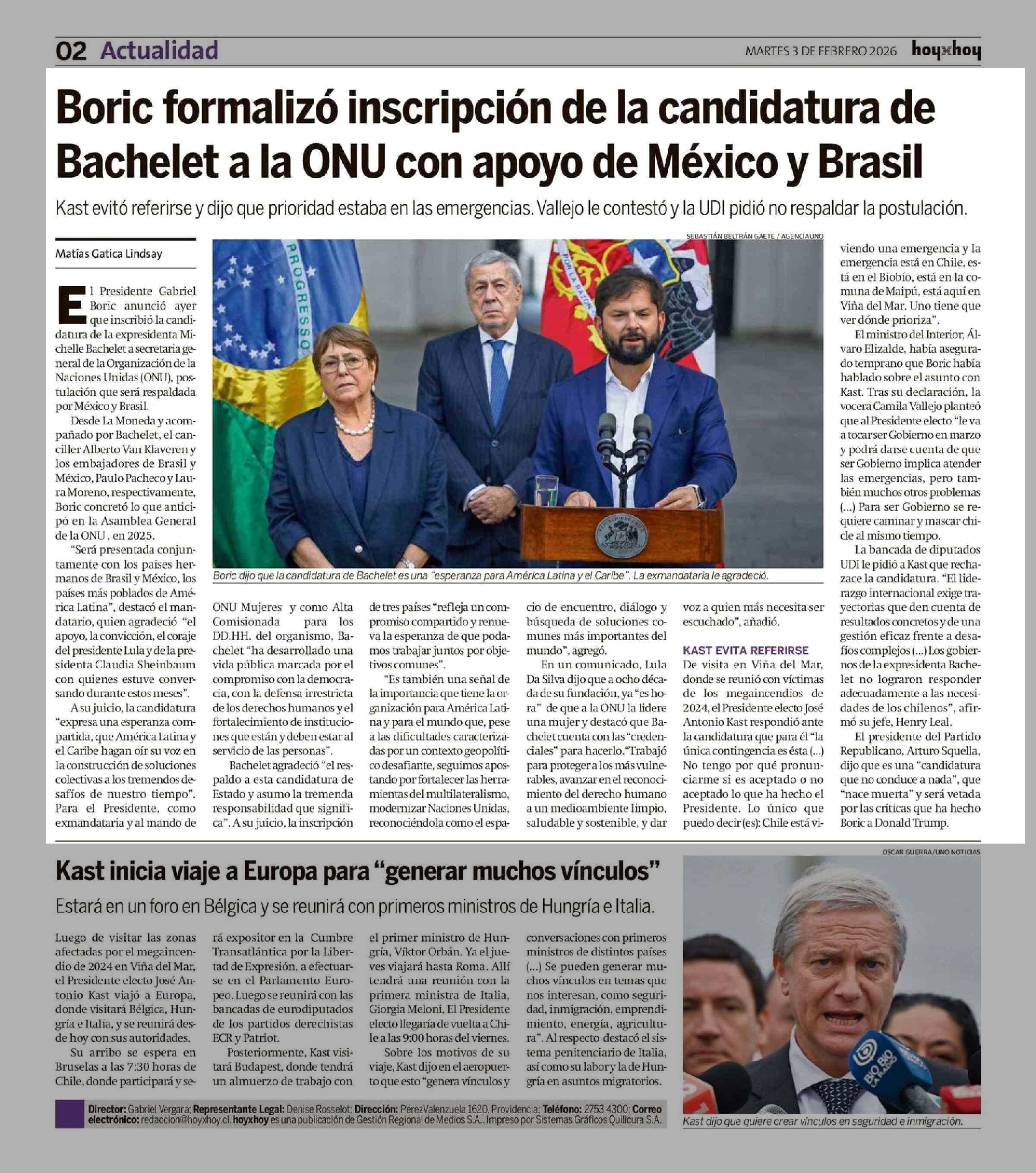 Boric formalizó inscripción de la candidatura de Bachelet a la ONU con apoyo de México y Brasil 03-02-2026 Hoy x Hoy |