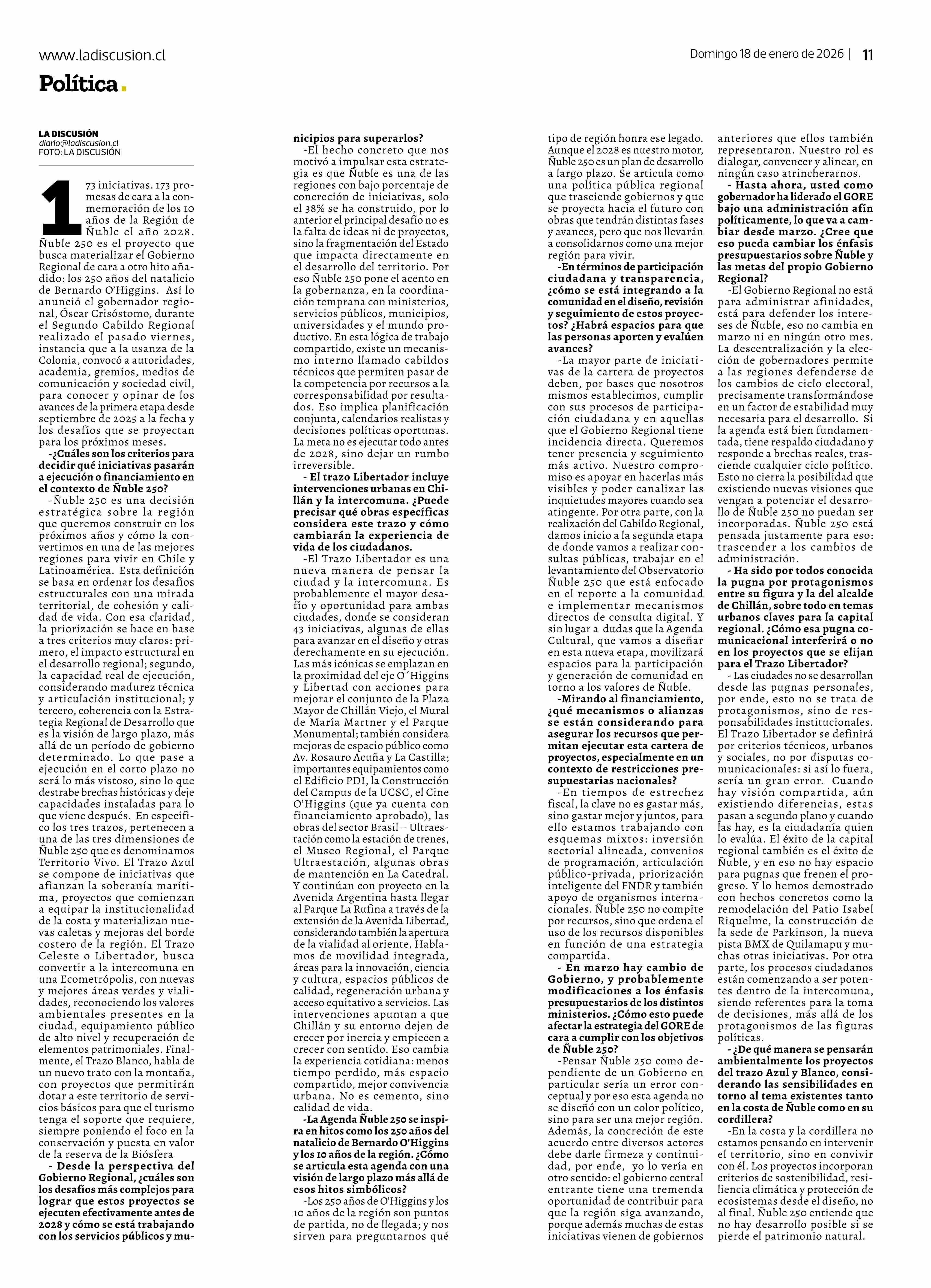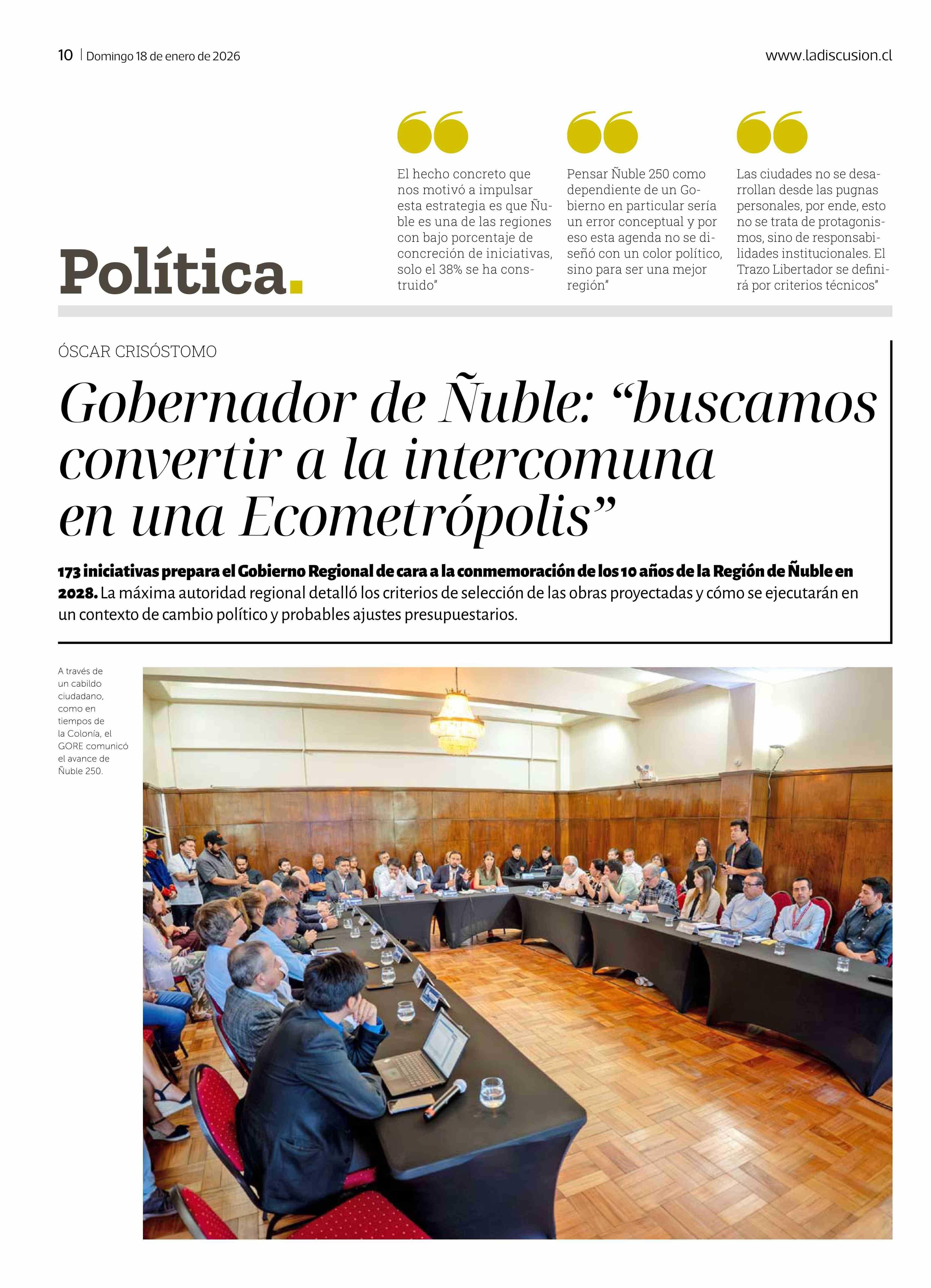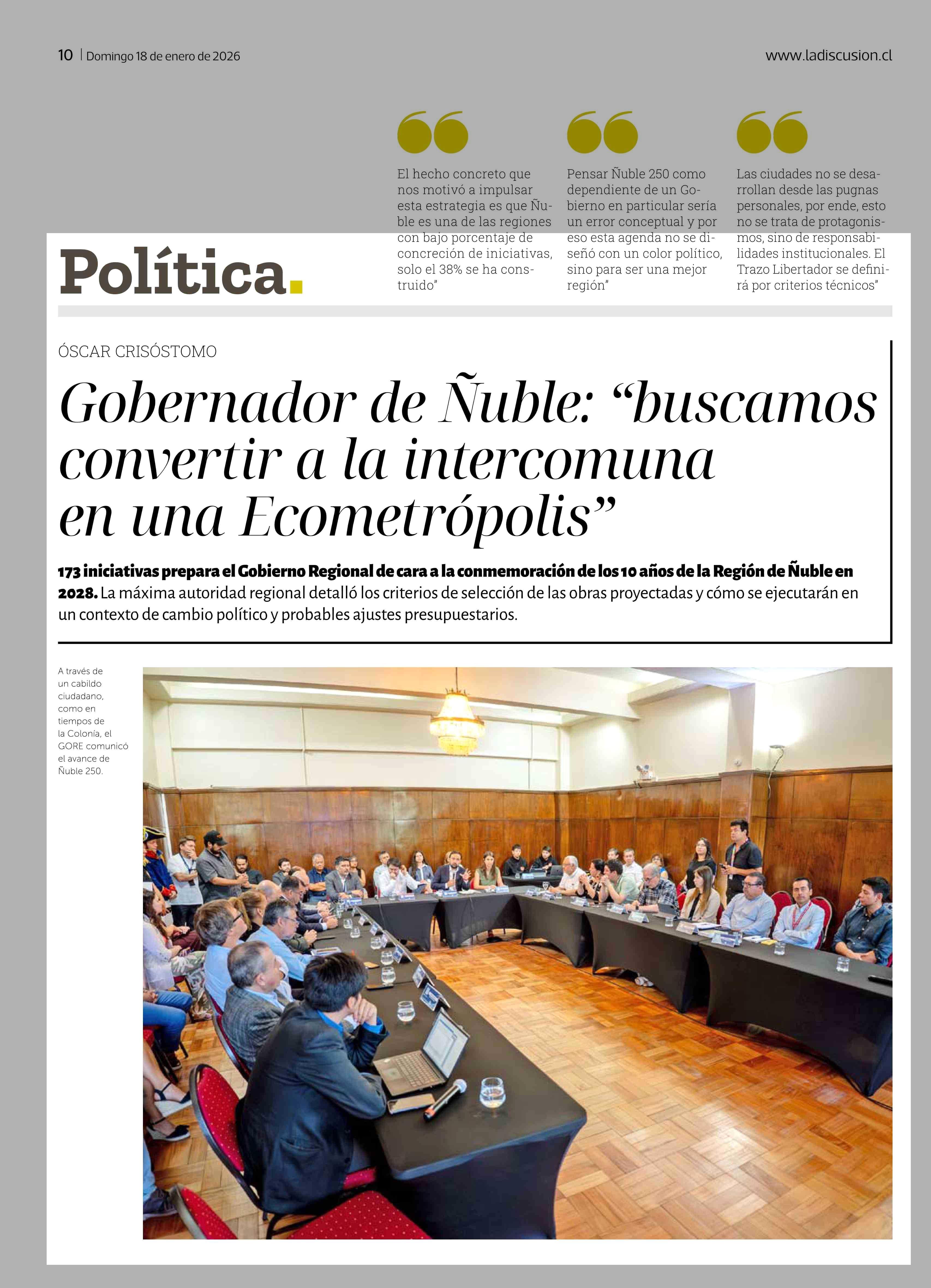Gobernador de Ñuble: "buscamos convertir a la intercomuna en una Ecometrópolis" 18-01-2026 La Discusión |