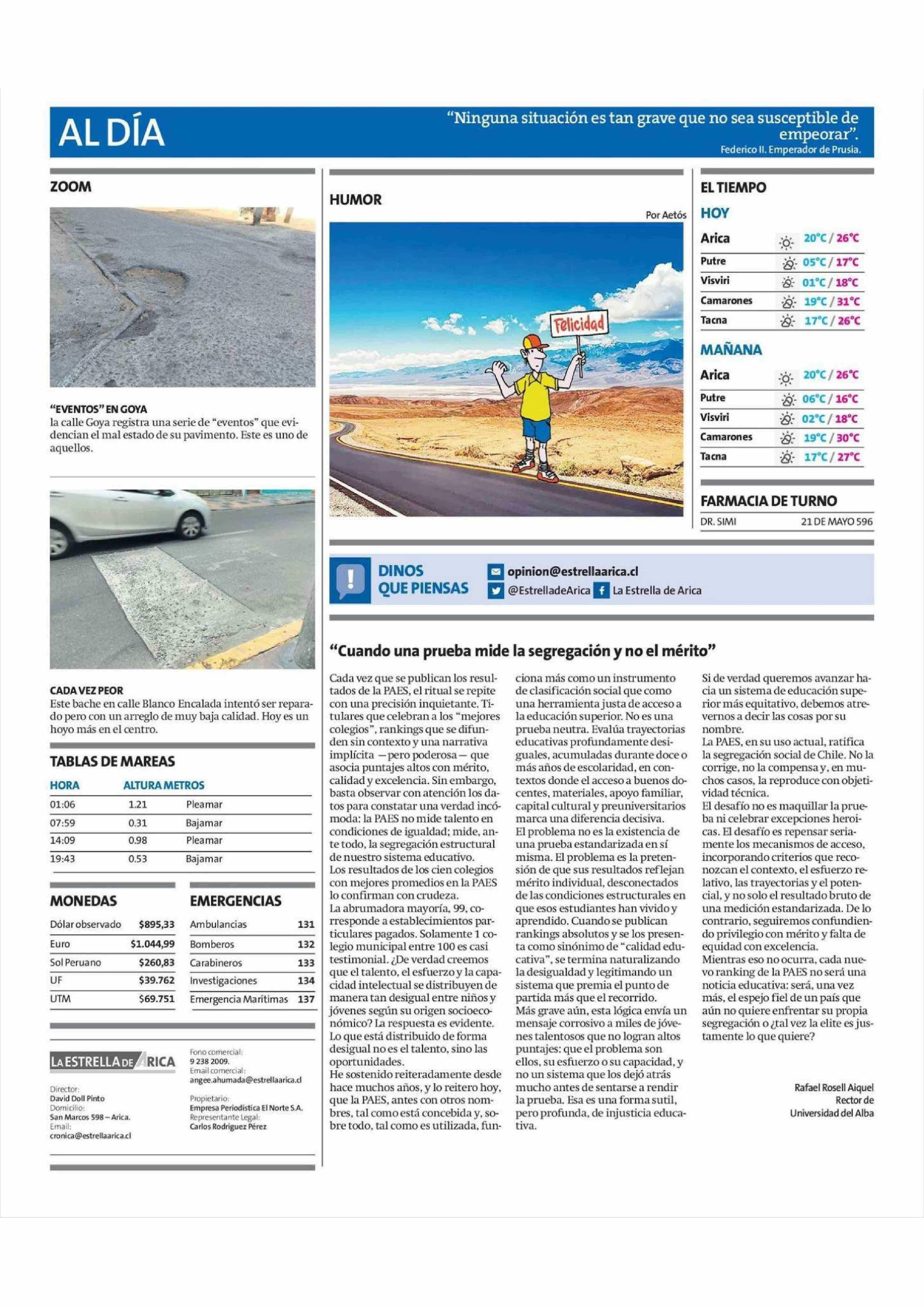 Cartas: "Cuando una prueba mide la segregación y no el mérito" 09-01-2026 La Estrella de Arica |