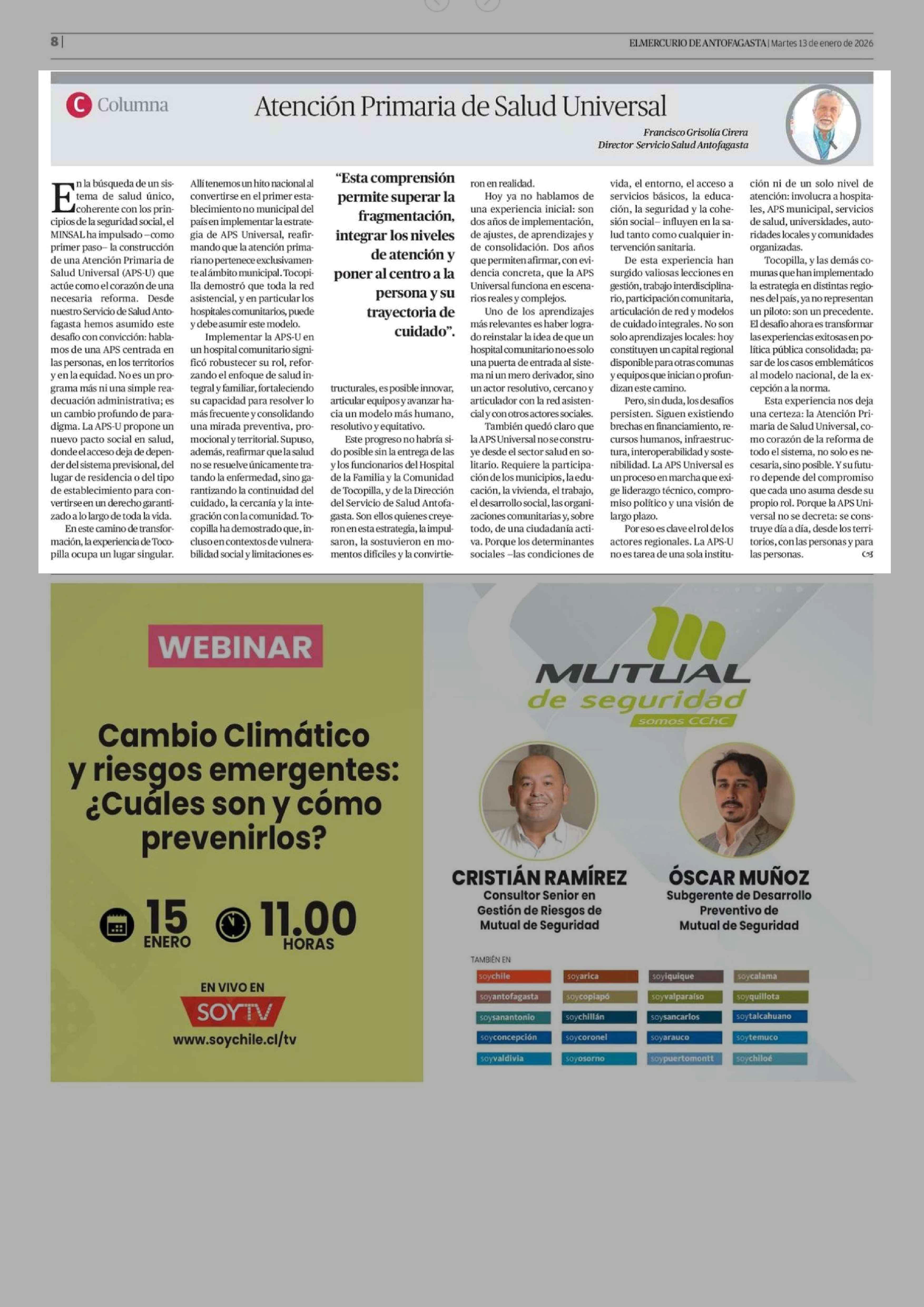 Columnas de Opinión: Atención Primaria de Salud Universal 13-01-2026 El Mercurio de Antofagasta |